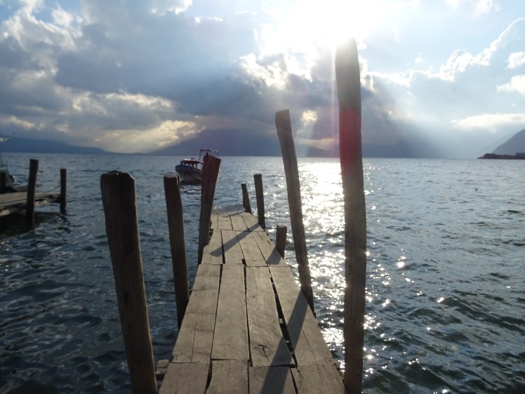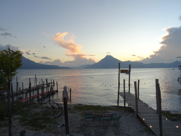 Panajachel ist sehr touristisch und alle wollen dir etwas verkaufen. Der Hunger treibt uns in ein Restaurant, in dem die Einheimischen sitzen. Wir bestellen Bier, Fisch und Hühnchen. Als das Bier vor mir abgestellt wird, drehen sich die Guatemaltekinnen zu mir um und warten mit offenen Mündern. Bei meinem ersten Schluck aus der Flasche kichern sie, aber winken mir trotzdem zum Abschied zu. Ich habe mir Fisch bestellt… Wo ist mein Kollege Stephan, wenn ich ihn brauche, der Fisch kommt mit Kopf, Schwanz und allem. Ich nerve den Wirt und er schneidet lieblos daran rum, Kopf und Schwanz sind immer noch dran. Augen zu und durch, ich seziere meinen ersten Fisch. Lecker, geht doch, bei Hühnchen werde ich das wohl nie können.