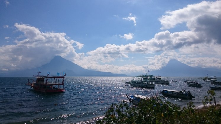 Wenn Antigua erwacht, merkt man das an den Shuttles, die über die kopfsteingeflasterten Straßen rumpeln und vor den Hostels halten. Das Gepäck wird aufs Dach gehievt und die Rucksacktouristen in die Busse gestopft. Ich fühle mich mit meinem Rucksack genauso jung wie sie und reiche mein Gepäck aufs Dach, im Minivan merke ich dann doch die Unterschiede: ich habe die Schnallen des Rücksacks nicht festgezurrt und so schlagen sie im Fahrtwind auf das Dach des Busses und täuschen prasselnden Regen vor. Außerdem rieche ich besser als die etwas muffigen Mitreisenden. Sobald man Antigua verlässt sind die Straßen wunderbar 2spurig ausgebaut. Echte Straßenbaukunst kommt hier zu Tage, mit abgesicherten Seitenwänden, denn die Straße wurde durch den Fels geschnitten. In dem Moment denke ich, dass ein Mietwagen vielleicht doch besser gewesen wäre, an der Tanke bei 3 Euro der Liter komme ich ins Wanken und nachdem wir auf den Nebenstraßen dreimal mit der Karre aufgesetzt haben und auch noch durch ein Fluss fahren mussten, ist mir klar „alles richtig gemacht!“Marcus sitzt eh neben dem Fahrer und spricht spenglisch, ein Mix aus Spanisch und Englisch. Aber das Lachen der Beiden ist international. In Panajachel angekommen, sind wir am Haupttouristen Ort des schönsten See der Welt. Der 128 Quadratkilometer große See ist eingebettet von Vulkanen und ganz viel Grün. Für das perfekte Postkarten-Motiv sind die 🌋 noch mit Wölkchen an den Spitzen garniert. Mein Fotografenherz schlägt schneller.