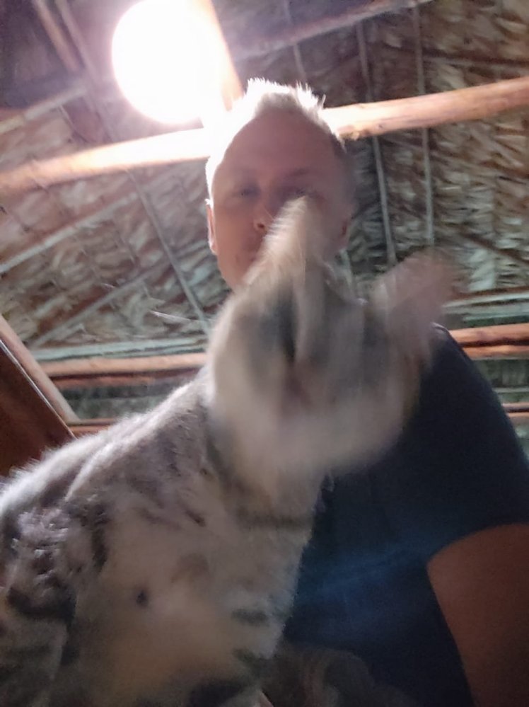 Marcus schläft noch und ich habe gerade das Fitnesstraining mit Stepaerobic, Griffkrafttraining, Rüttelplatte für die Balance, Schwimmen und anschließend eine Spabehandlung gebucht…und das sieht in Guatemala so aus…Doch zunächst sitzt mir Marcus etwas miesepetrig beim Frühstück gegenüber, doch nach dem letzten Schluck Cafe sitzt da nicht mehr Marcus, sondern Katerjones und mit Katerjones kann man das Fitnesstraining hier locker angehen.