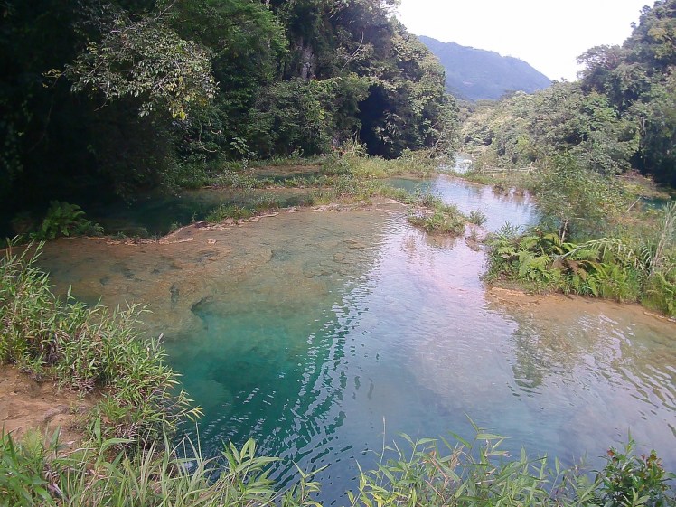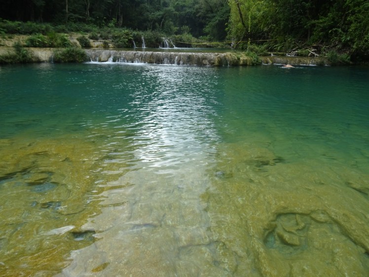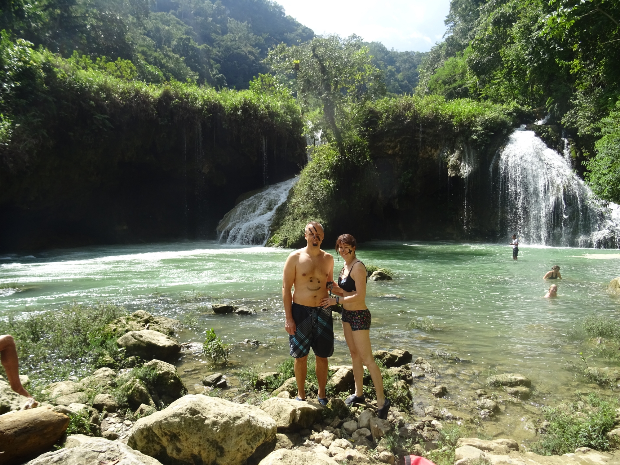 Nach einer Stunde Muskeltraining vom Festhalten kommen wir in Semuc Champey an. Zunächst geht es in die Höhle und zwar nur mit Badesachen und Kerze. Die Höhlenbesichtigung ist einzigartig. Es ist dunkel und man watet direkt durchs Wasser und hält sich an einem gespannten Seil fest. Das Wasser wird tiefer, die Höhle noch dunkler und irgendwann schwimmt man mit der Kerze in der Hand durch den unterirdischen Fluss. Dabei bleibt es nicht, es muss über glitschige Leitern geklettert werden und sich an Felsen vorbeigezwängt werden. Und dann hört man das Rauschen des Wasserfalls, diesen kann mithilfe eines Seils hochklettern oder an einer Leiter. Katerjones wählt das Seil, Respekt! Nur wer die Höhle bezwungen hat, bekommt noch in der Höhle die Mayabemalung.