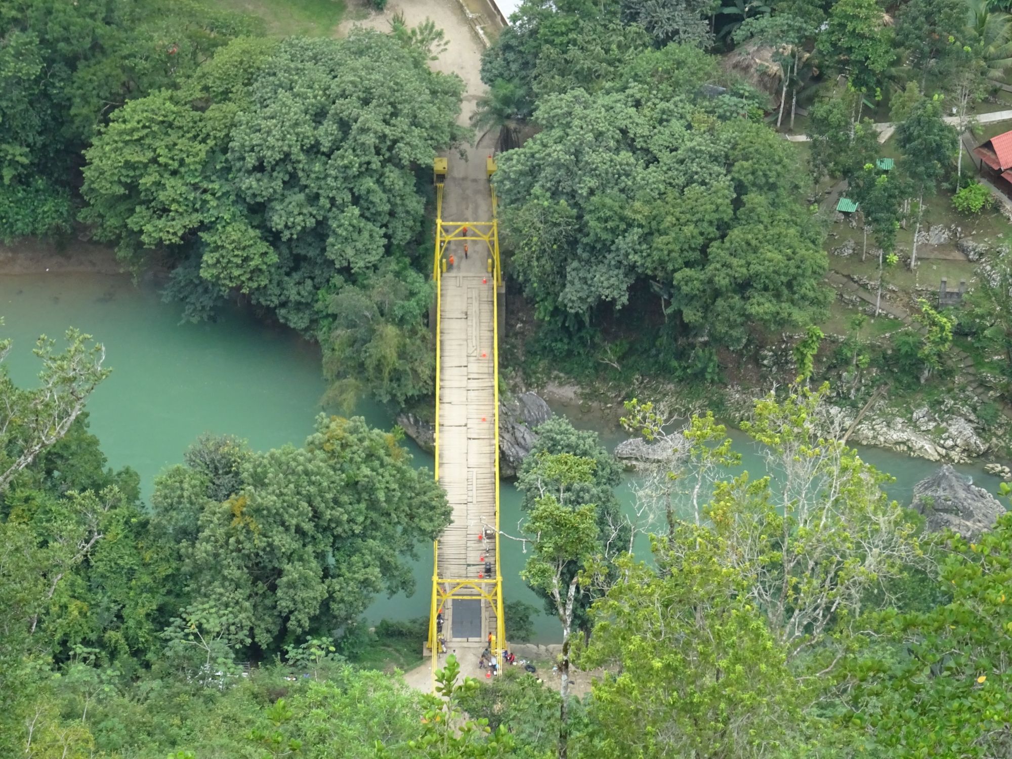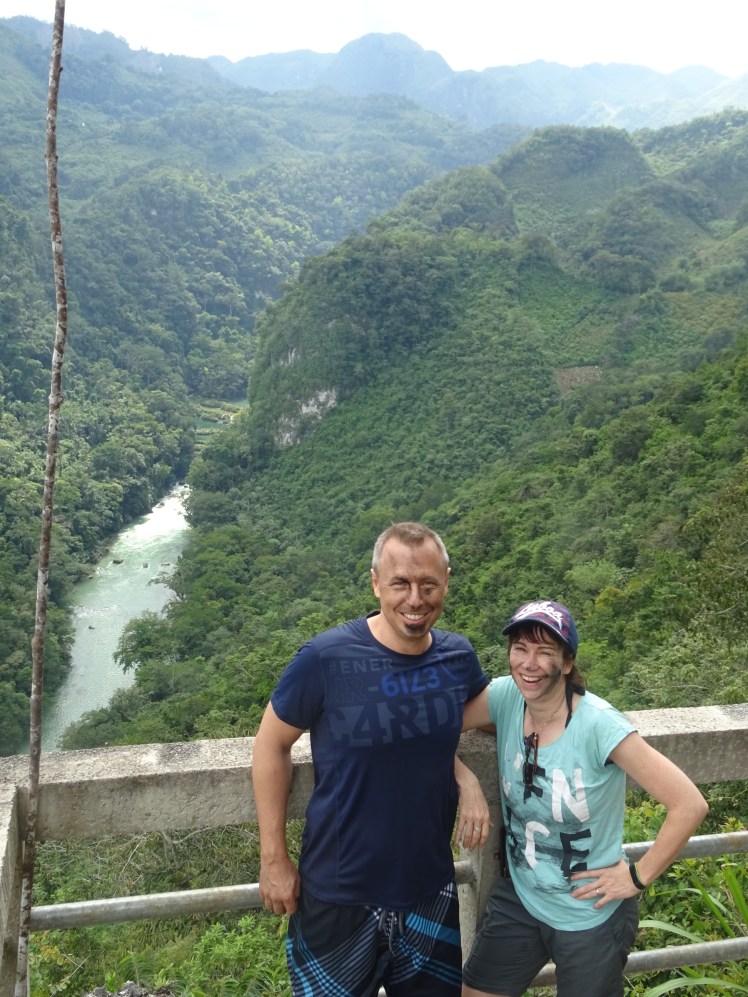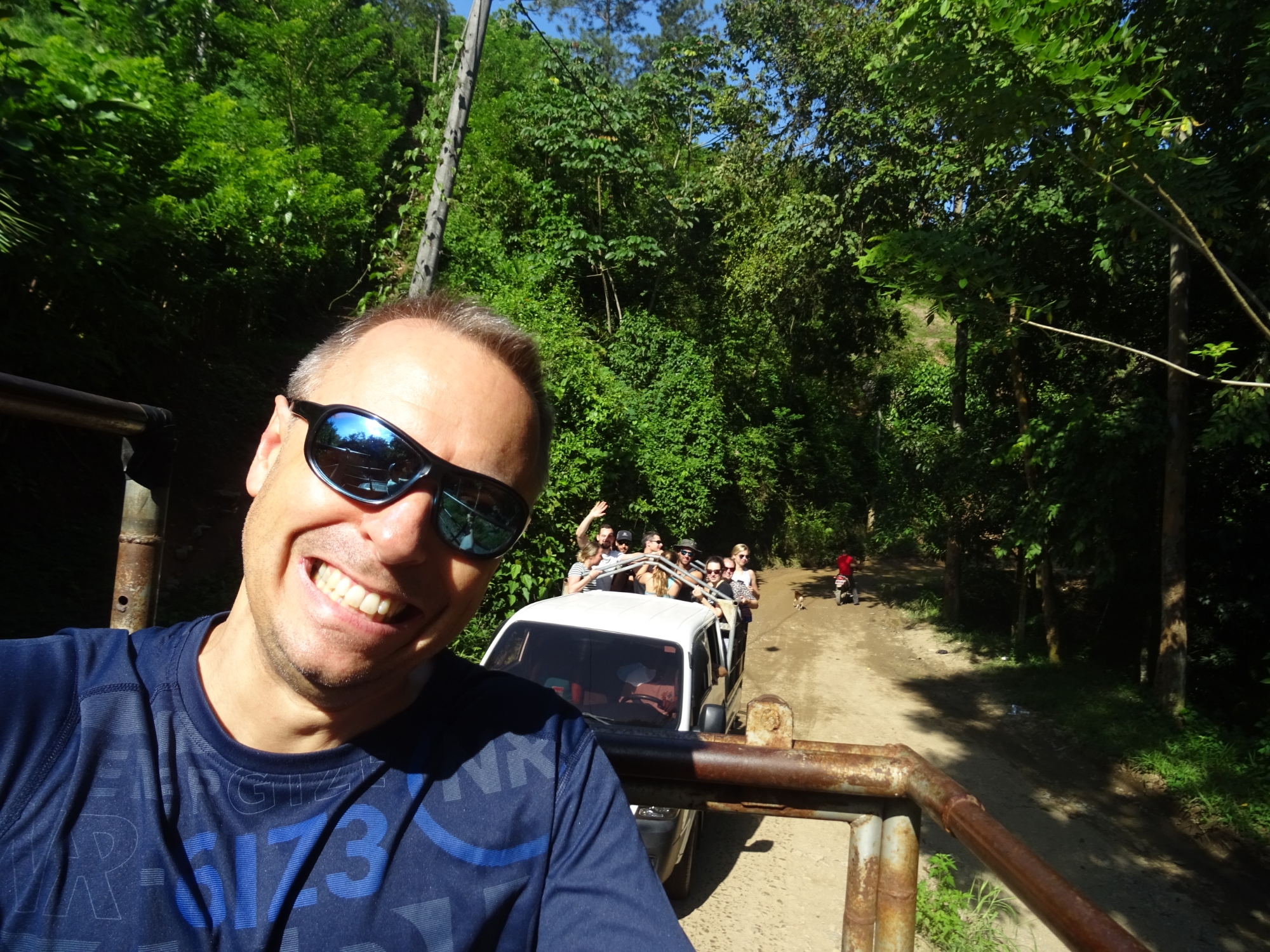 Trainingsgerät betreten und locker in den Knien stehen, Griffe festhalten und Rüttelplatte starten und ab jetzt eine Stunde so bleiben. Unser Trainingsgerät ist natürlich die Ladefläche eines Pickups und mit dem fahren wir über die schlechte unbefestigte Straße zu den Kalksteinterrassen Semuc Champey.
