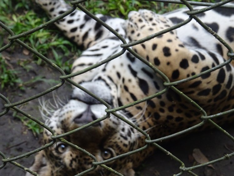 Der Jaguar benimmt sich wie eine Hauskatze und dreht sich in unsere Nähe auf den Rücken und schnurrt. Ich glaube Marcus ist auch noch ein Katzenflüsterer. Zu mindestens dreht sich die Großkatze immer zu ihm und tapst mit den Pranken in die Luft.