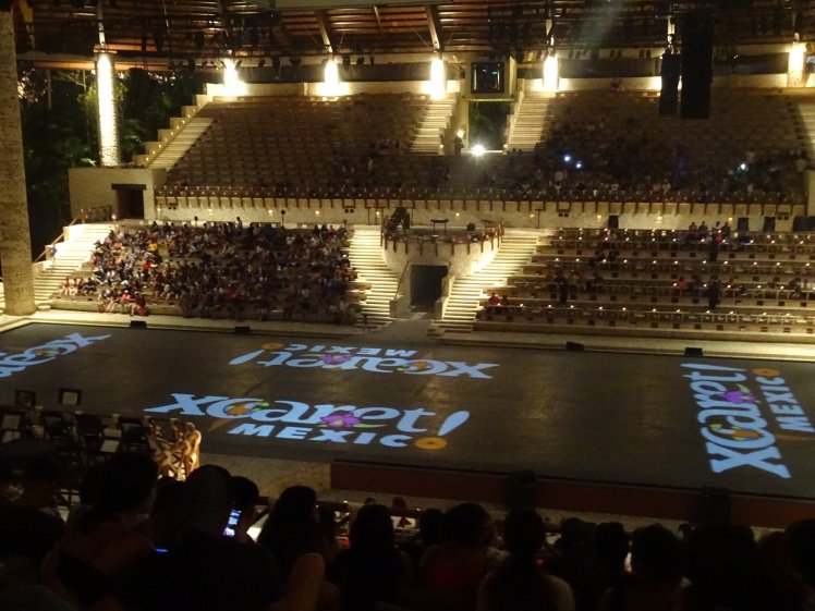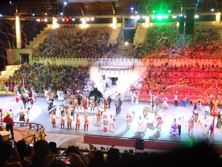 12 Stunden sind wir hier und trotzdem hat es nicht ausgereicht, alles in Ruhe zu machen.Und da sitzen wir nun bei der Show, die die Geschichte Mexikos farben- und musikkräftig erzählt. Das Publikum ist völlig aus dem Häuschen und honoriert jeden Auftritt mit großem Applaus.