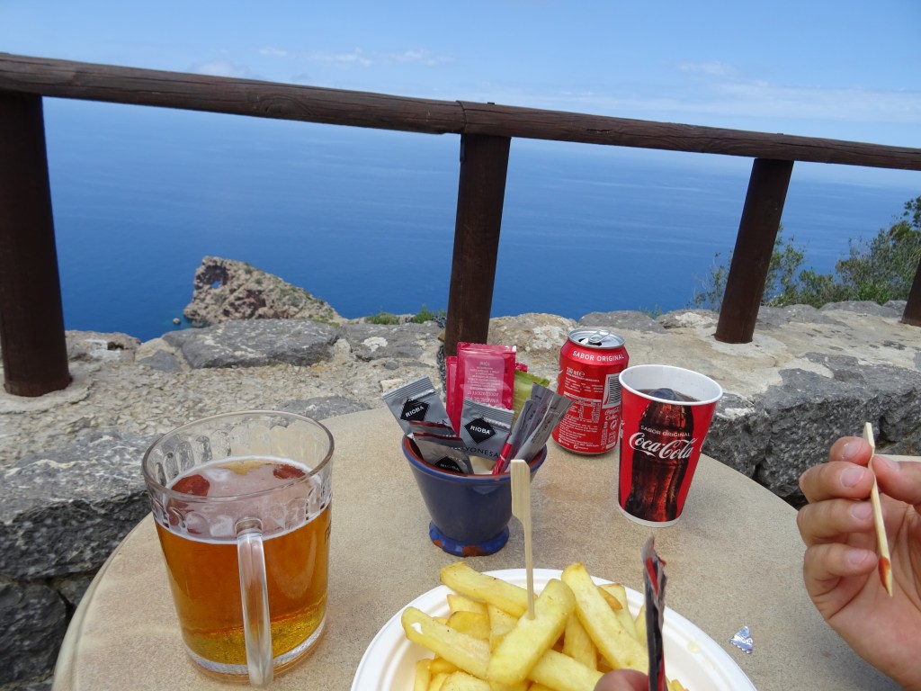3 Stunden später sind wir wieder am Place to be und diesmal gibt es Bier und Pommes mit Blick auf Foradada.