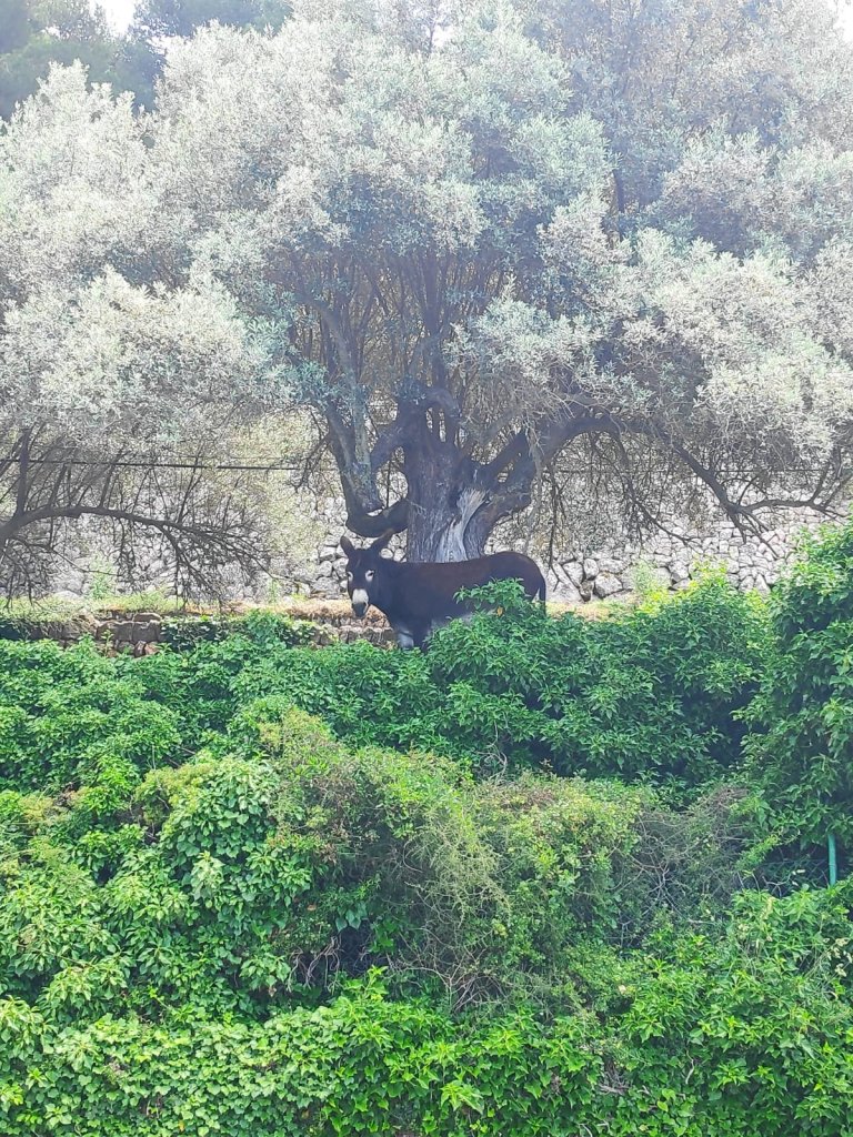 Seit Beginn unserer Reise schleppen wir einen Apfel mit als Wegezoll für einen Esel, allmählich wird es Zeit diesen Apfel zu verfüttern. Den Esel, den wir finden, wohnt an einer schönen Villa und knabbert an den Blättern der Bäume herum. Marcus nimmt den Apfel, zielt und wirft ihn dem Esel direkt vor die Hufe. Der kapiert schneller als gedacht und frisst ihn so genüßlich, dass ihm das Wasser aus dem Maul läuft.