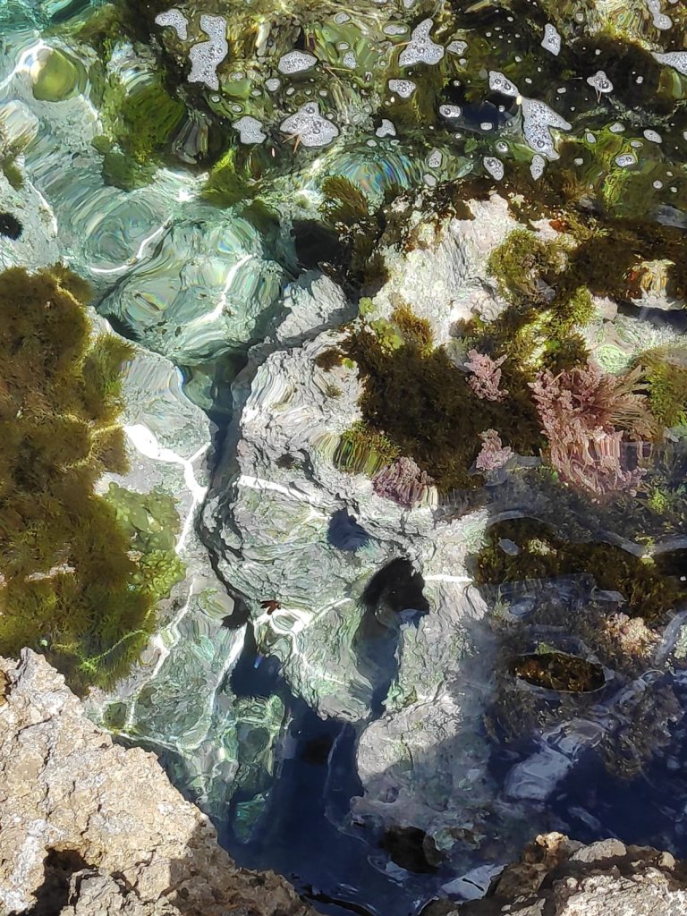 Unten angekommen sieht man das Loch im Felsen dann doch nicht wirklich, der Winkel stimmt nicht mehr. Marcus schafft es sogar noch bis zum Steg und schießt ein Foto vom kristallklaren Wasser mit Seeigel.