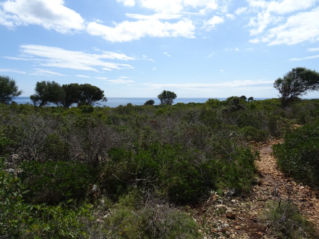 Wir steigen an der Bucht auf die Steinklippe und lassen uns die Beine von der Macchia zerkratzen, das Gestrüpp bedeckt hier den ganzen Boden und wächst immer wieder in die Trampelpfade hinein.