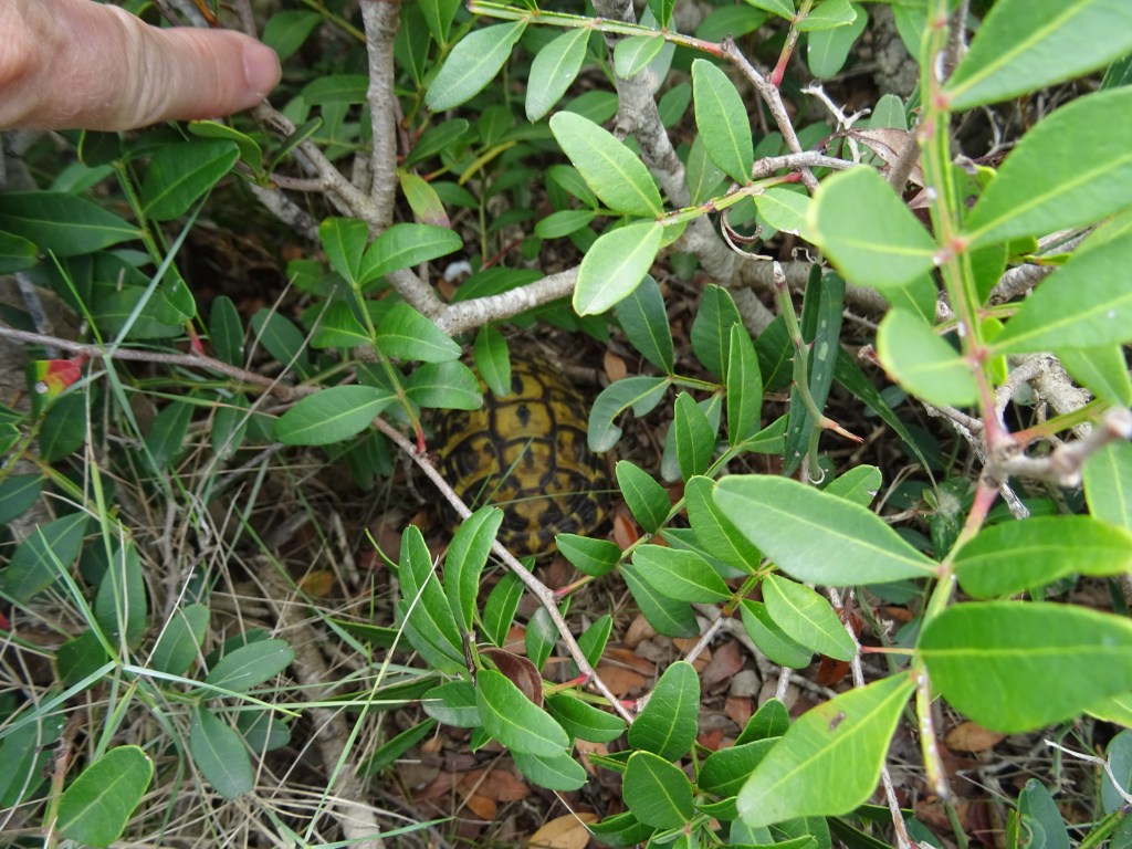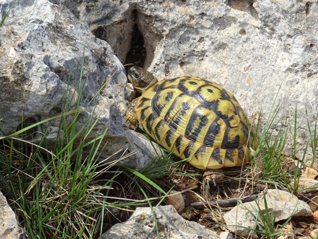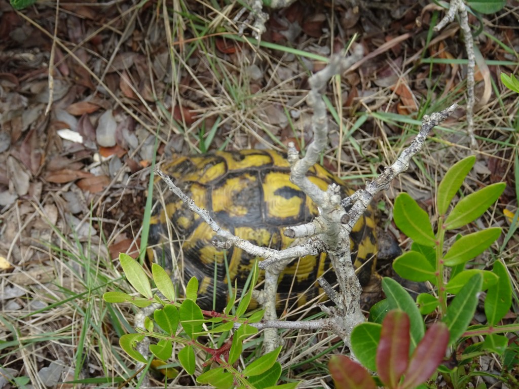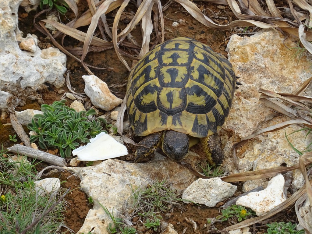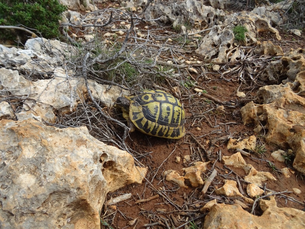 Auf dem Weg beginnt Marcus irgendwann zu schnuppern und fragt mich, ob ich das auch rieche: „das riecht nach Verwesung!“ Ich bin überhaupt nicht scharf darauf ein verendetes Kaninchen, Ziege oder Touristen zu finden und bin ganz froh, dass Marcus immer ein paar Meter voraus ist. Dann höre ich ihn berufsbedingt rufen: „Fund!“ und ich schimpfe, dass ich das so ekelig finde. Das Gebüsch steht für mich etwas zu hoch um etwas sehen zu können, da kniet Marcus auch schon ab und macht Fotos. Als ich zögerlich und angewidert bei ihm angekommen bin, grinst er wie ein Honigkuchenpferd und da weiß ich auch warum. Sein Fund war nämlich ein lebendiges Tier und dazu auch noch sein Lieblingstier und das auch quicklebendig. Marcus hat zum ersten Mal auf Mallorca eine freilebende Schildkröte gefunden und ich kann es nicht fassen.