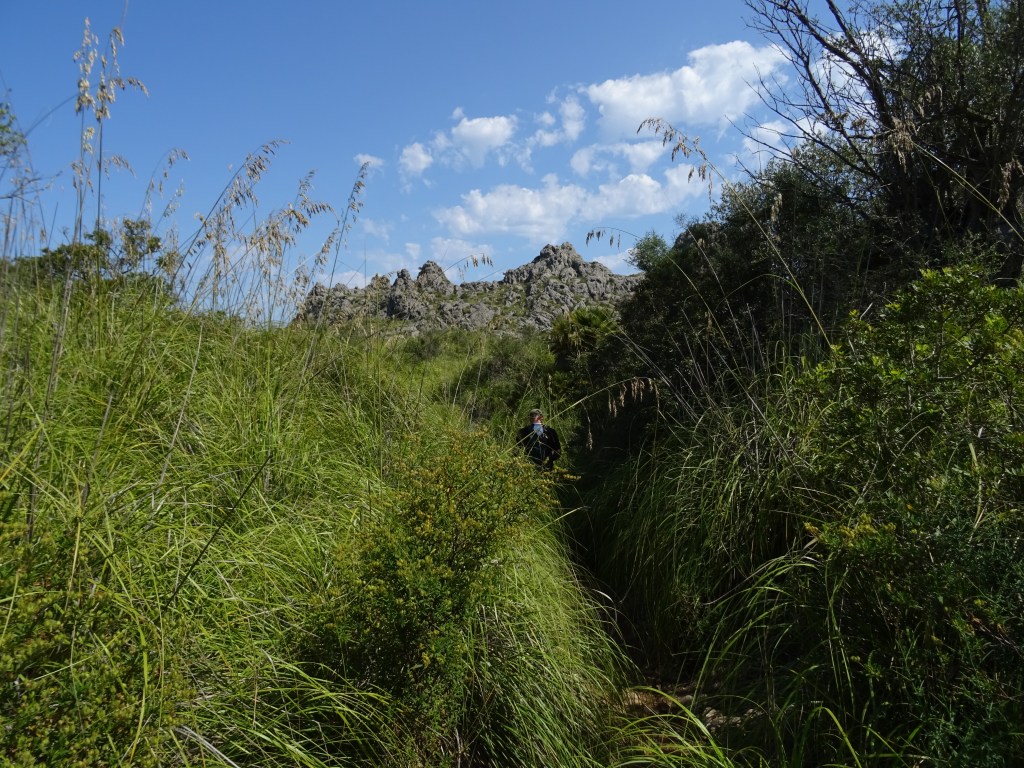 Aus Erfahrung weiß ich, dass der Weg über das Gelände nicht leicht zu finden ist und man oft am Dissgras hängen bleibt. Die Entscheidung war genau richtig, denn allein auf dem Weg in die Schlucht ist das Gras Mannshoch und schneidet sich in die Haut, wenn man aus Versehen drauftritt und es damit unter Spannung setzt und sich so selbst geißelt. Wir gehen also durch die Trampelpfade bis zum Schluchteingang und da habe ich schon die Nase voll von dem Dissgras, dass mir die Knie angeritzt hat. An meine kurzen Hose kann ich die Beine wieder per Reißverschluss anbringen, Marcus hat die selbe Hosen an, nur hat er seine langen Beine vergessen.