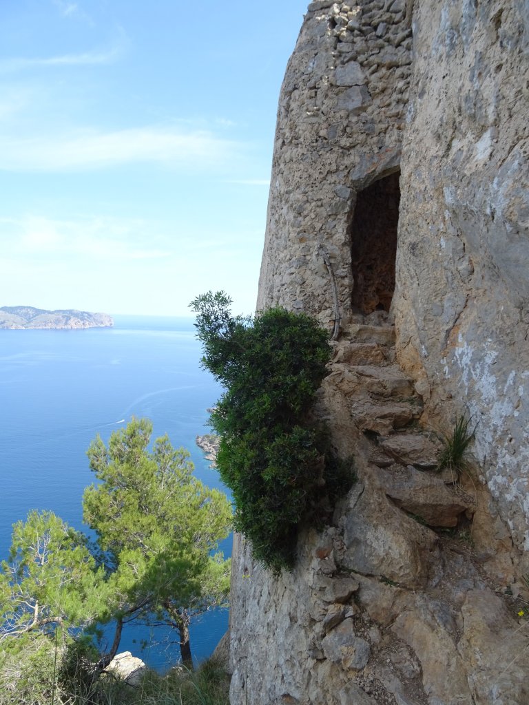 Der Wanderweg geht schmal an der Bergkante entlang und endet am Steilfelsen, wo man ein „Schwalbennest“ angeklatscht hat und so kann man durch den 1,50 m hohen ziemlich engen Durchschlupf auf die andere Seite des Fels gelangen, ein bisschen Schwindelfrei sollte man sein.