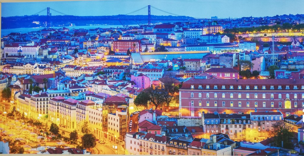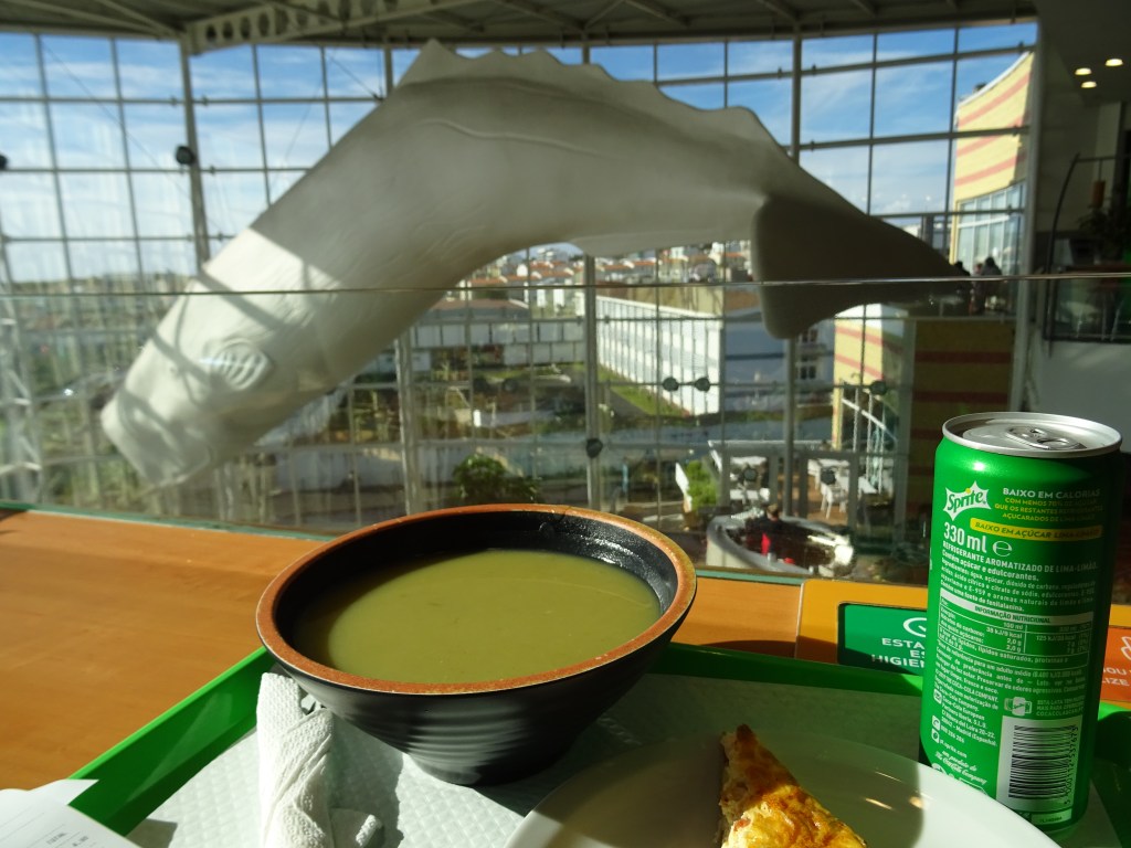Die schnelle Entgegennahme des Mietwagens lässt uns Zeit für die große Shoppingmall in Ponta Delgada, denn wir brauchen noch Proviant für unsere erste Ferienwohnung. Zunächst schlagen wir uns aber die Bäuche in der Foodcorner voll, mit bestem Blick auf den Wal, der von der Decke hängt und die Rolltreppe, die die hungrigen Mäuler auf die obere Etage hievt. So kann man abwechselnd lästern und die Suppe auslöffeln.