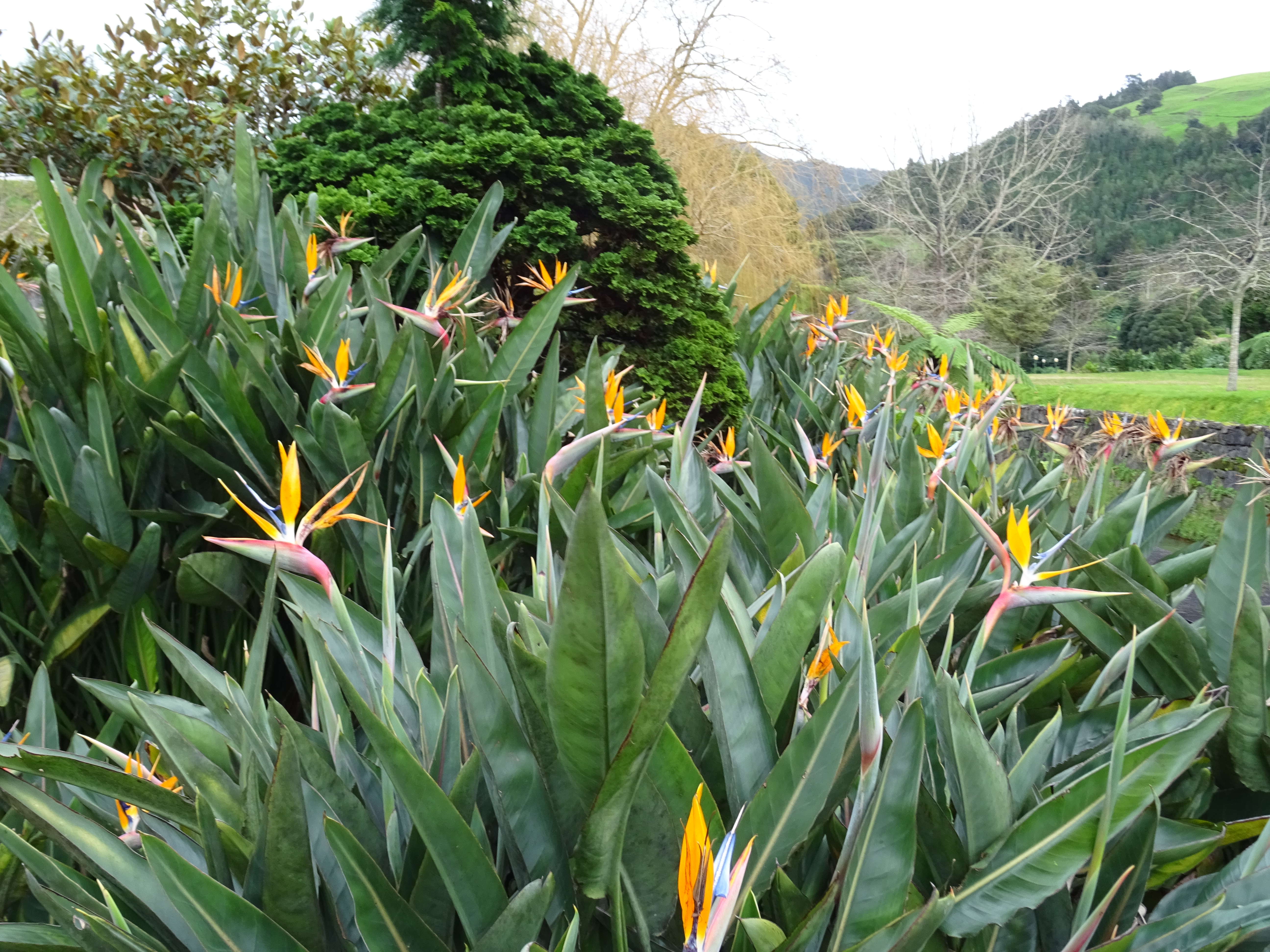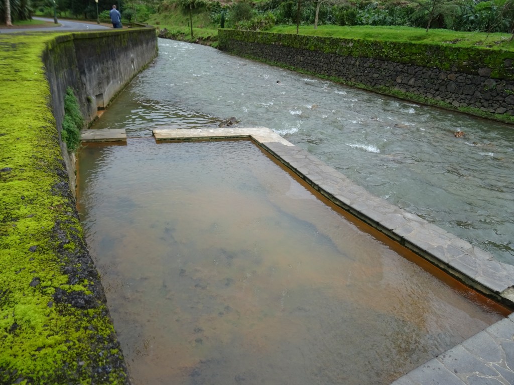 Auf der Fahrt nach Furnas sehen wir die Küste und das Grün der Insel in allen Facetten Grasgrün, Moosgrün, Blattgrün, Tannengrün, ….üppige Weiden, auf denen die Rinder grasen und dann wieder Wälder, die der Borkenkäfer hier verschont hat. Furnas liegt in einem Talkessel und bietet Parks und Wasserläufe jeglicher Art, aber eigentlich ist