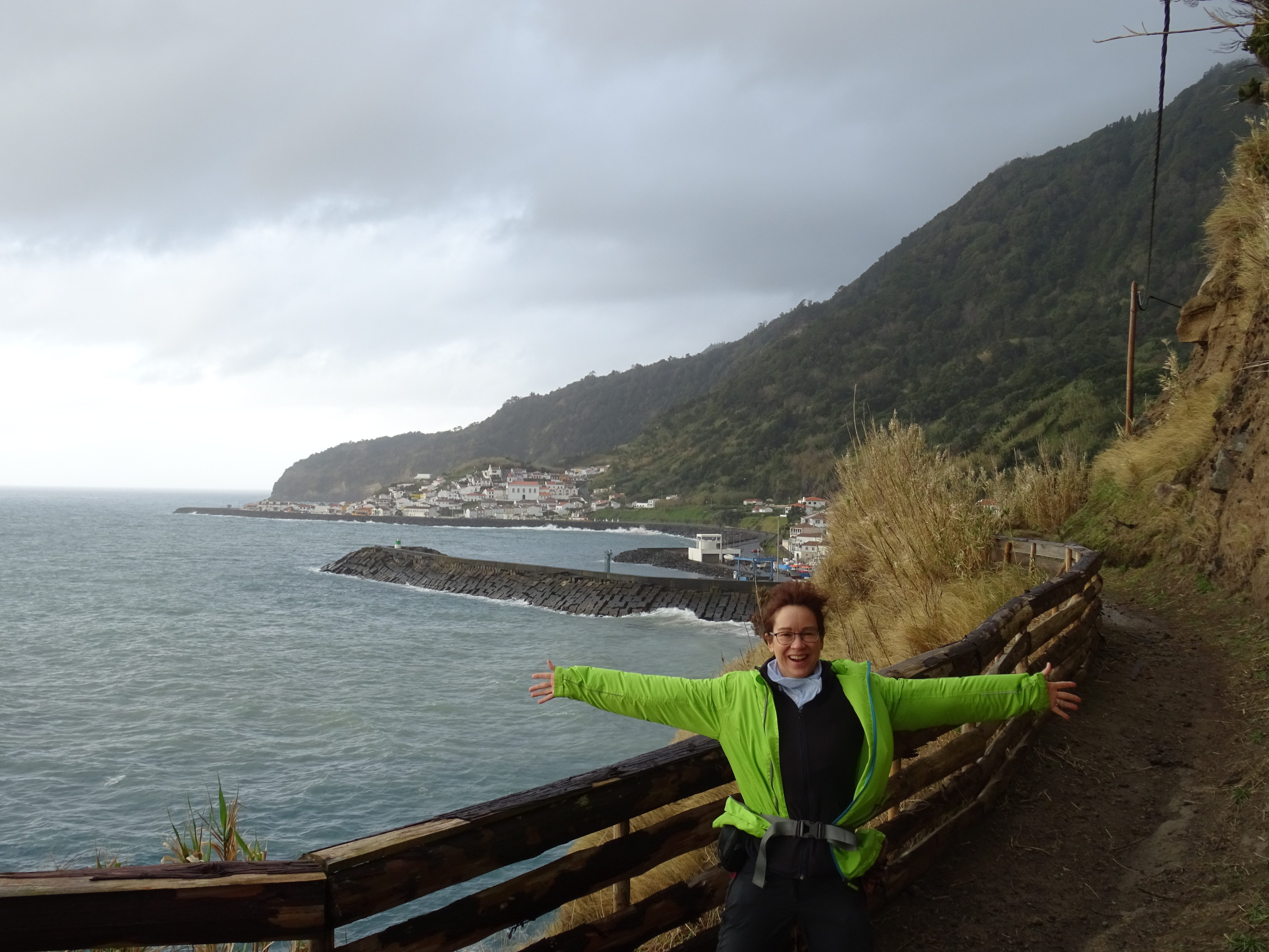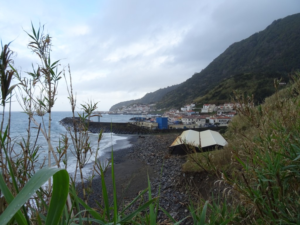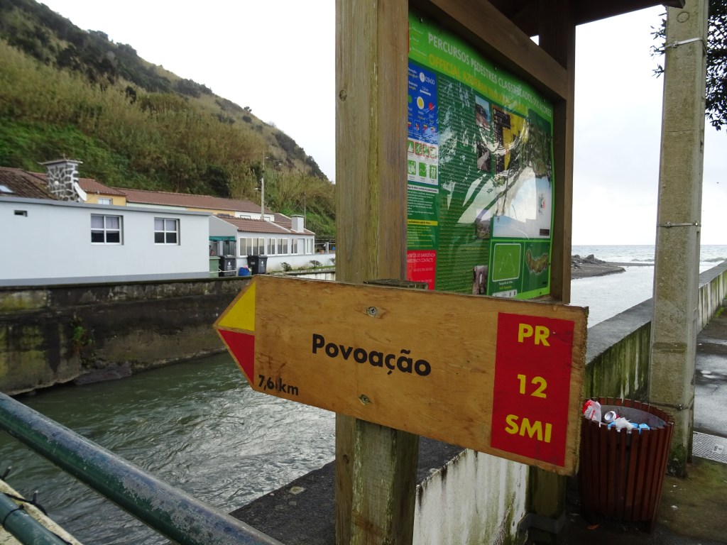 Nach 2 Stunden treffen wir auf die Fahrstraße und dort lauert doch in der Tat unser Taxifahrer, ich bin versucht einzusteigen und mich bis zum Küstenort fahren zu lassen, wenn mich da nicht dieser durchdringende Blick von Marcus getroffen hätte. Wir trotten also weiter, biegen falsch ab und werden von 3 Hunden auf Privatbesitz aufgeregt angebellt, der Besitzer zeigt uns den richtigen Weg und so kommen wir an dem kleinen verschlafenen Povoacao an, das doch sehr einladend aussieht.