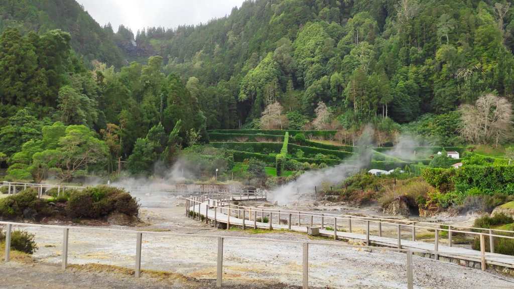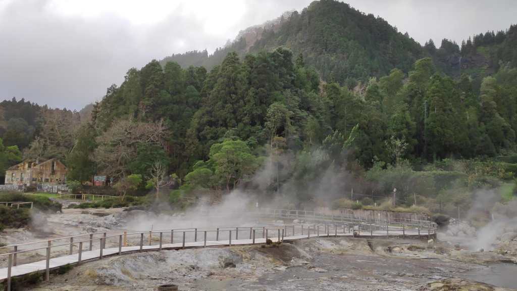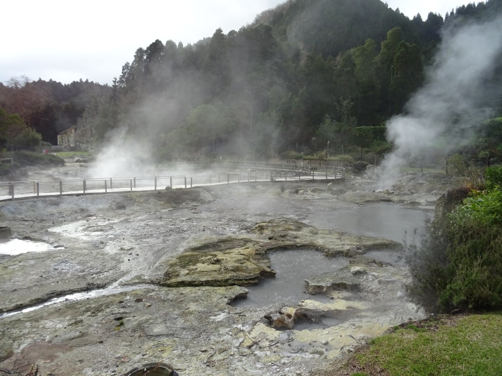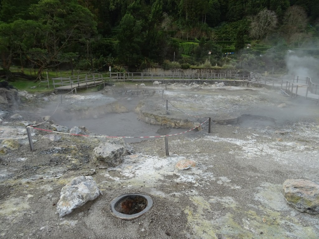 Mit dem Taxi geht es zurück nach Furnas und wir steigen in den Mietwagen um und fahren zu den stinkigen Geysiren, die alle Touris besichtigen. Gesehen haben muss man sie nicht wirklich, die schwarze blubbernde Brühe und die Löcher für die versenkten Eintöpfe sind wenig spektakulär, dafür stinken sie aber wie ganz große.