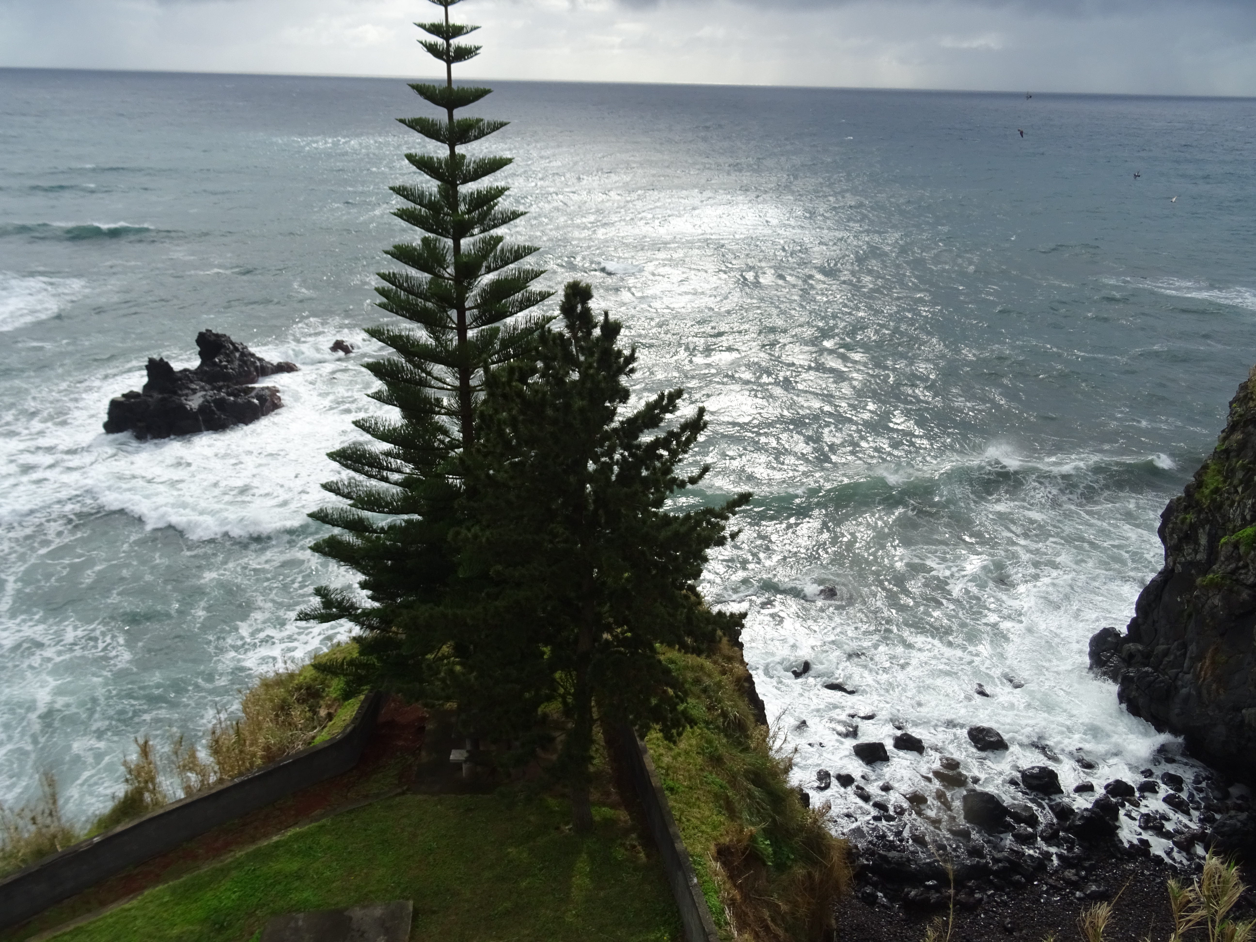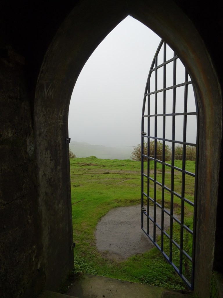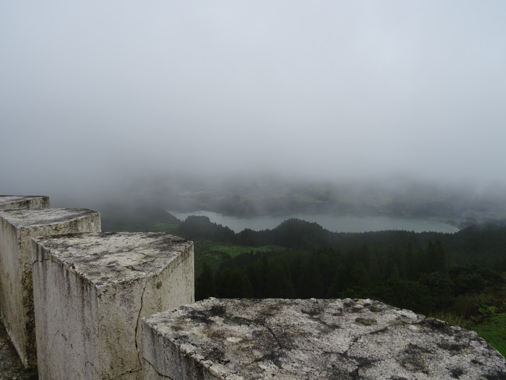 Marcus Kommentar zu dem Fernsehbericht: „Ach, das überzeugt mich nicht wirklich!“ Heute ist der Tag, an dem er das ganze selbst erlebt, doch zunächst hat er sich einen Turm ausgesucht, der im Highlander- Film vorkommt. Der Turm ist auch ein wunderbarer Aussichtspunkt auf der Insel, denn von hier kann man unseren See von Furnas und gleichzeitig den Atlantik sehen, wenn da nicht dieser Nebel wäre. Ich schwör, man könnte bei Sonnenschein beides sehen.