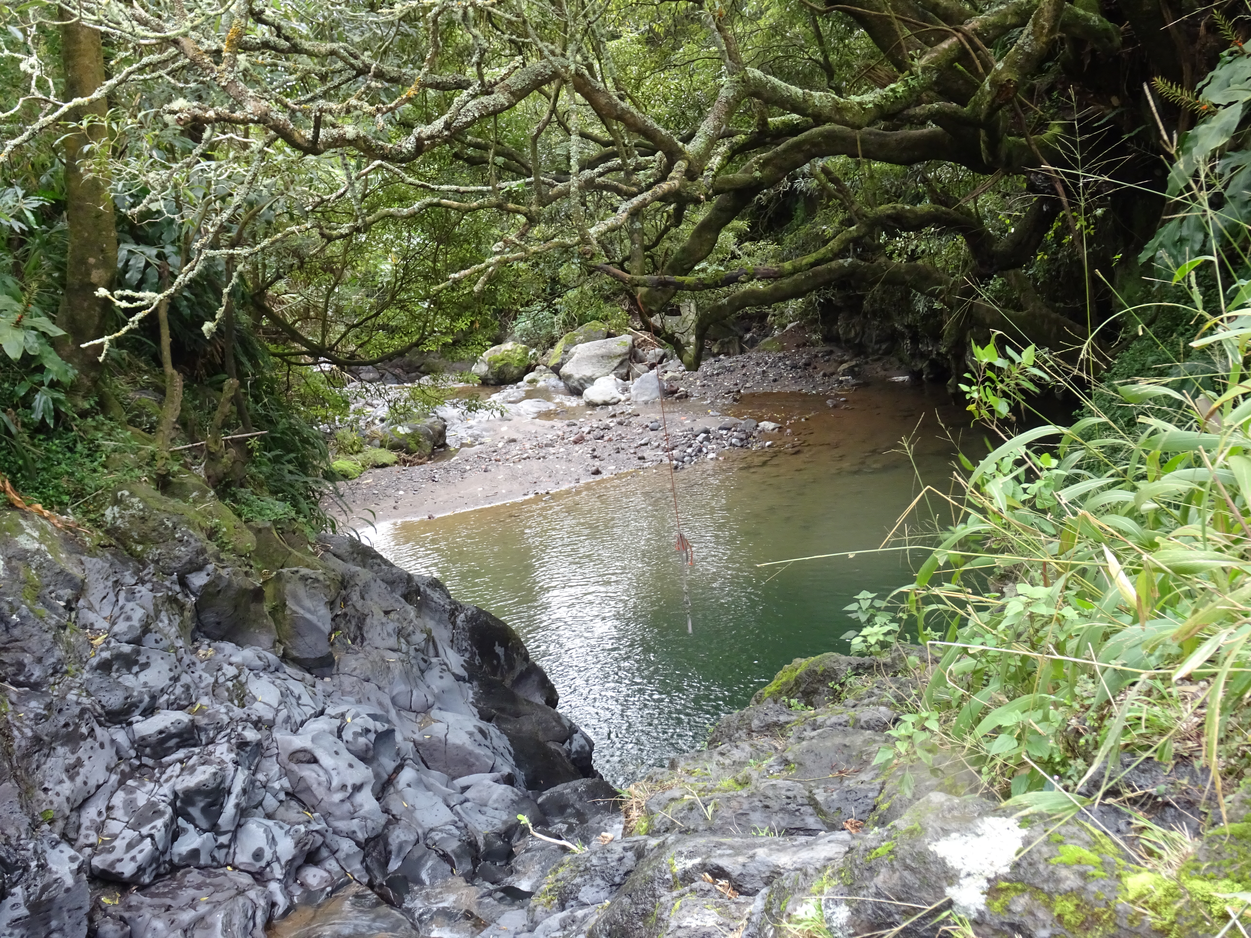 Ich hatte im Reiseführer noch von einem Wasserfall gelesen und den suchen wir jetzt, eine Miniwanderung führt uns an einer Gumpe vorbei, durch das Flussbett bis zu dem Wasserfall Segredo.