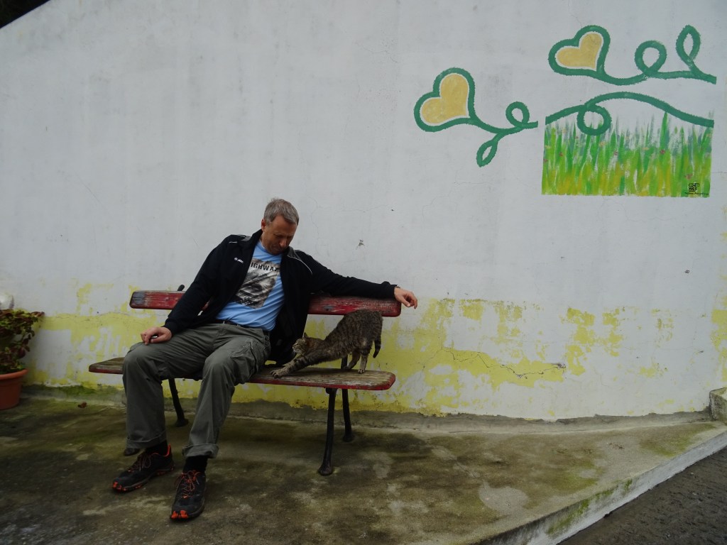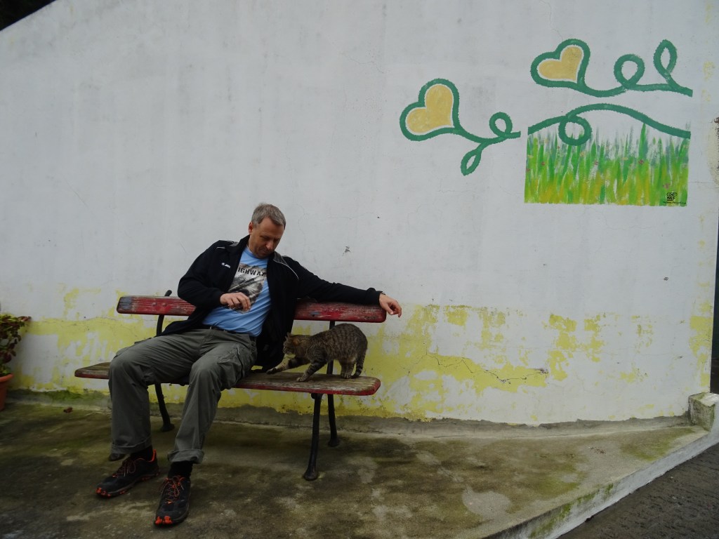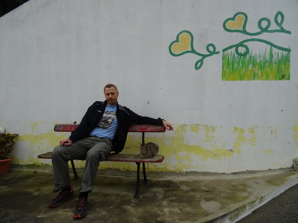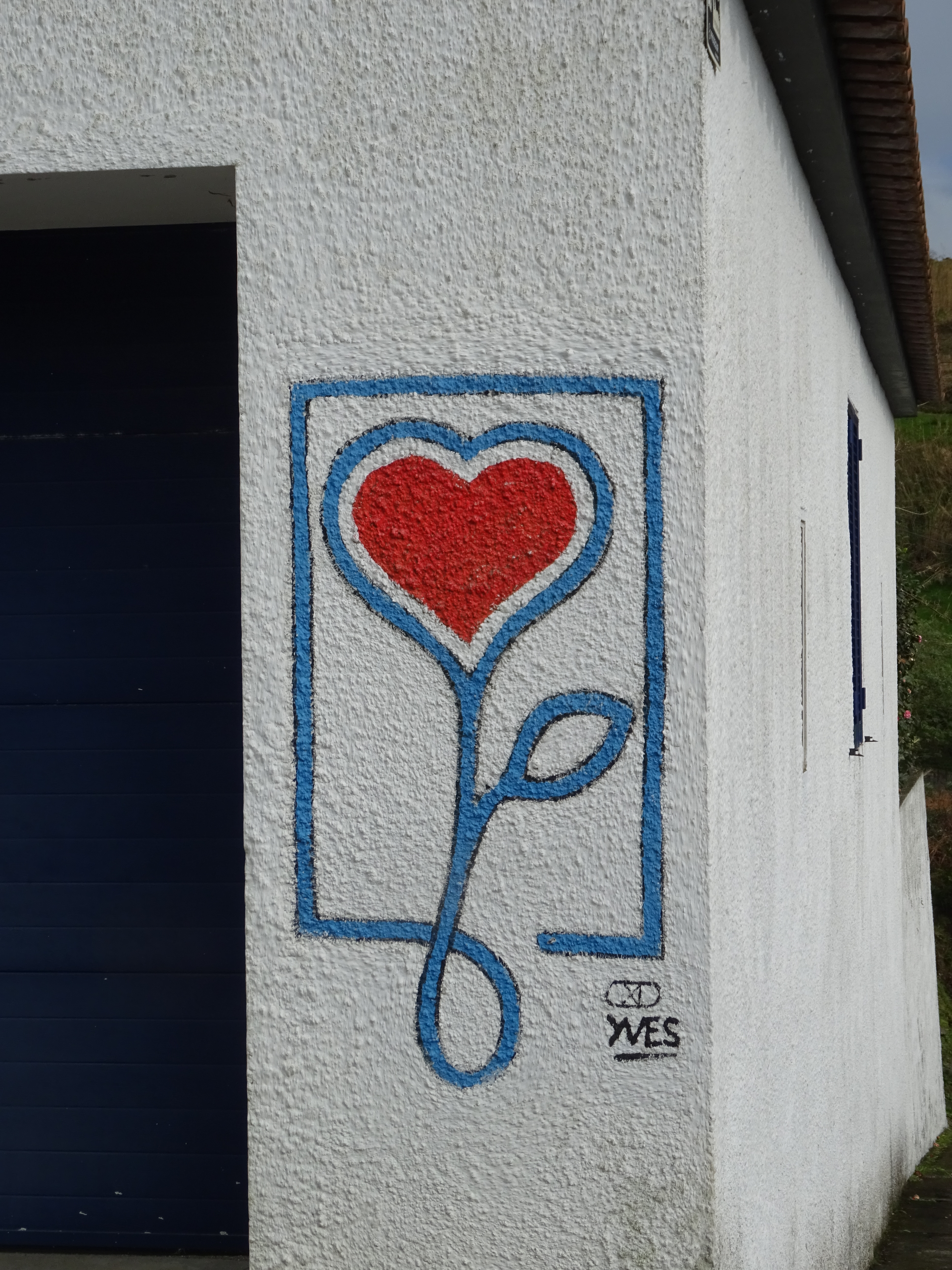 Auf dem Rückweg setzt sich Marcus auf eine Bank zu einer Katze und während die beiden gleichzeitig ihre Krallen ausfahren, schieße ich das Foto und bemerke dabei, welche Kulisse ich aufgenommen habe. Der Künstler Yves hat sich auch hier mit einem seiner Herzchenbilder verewigt, ab jetzt versuche ich mehr von diesen Bildern zu entdecken.