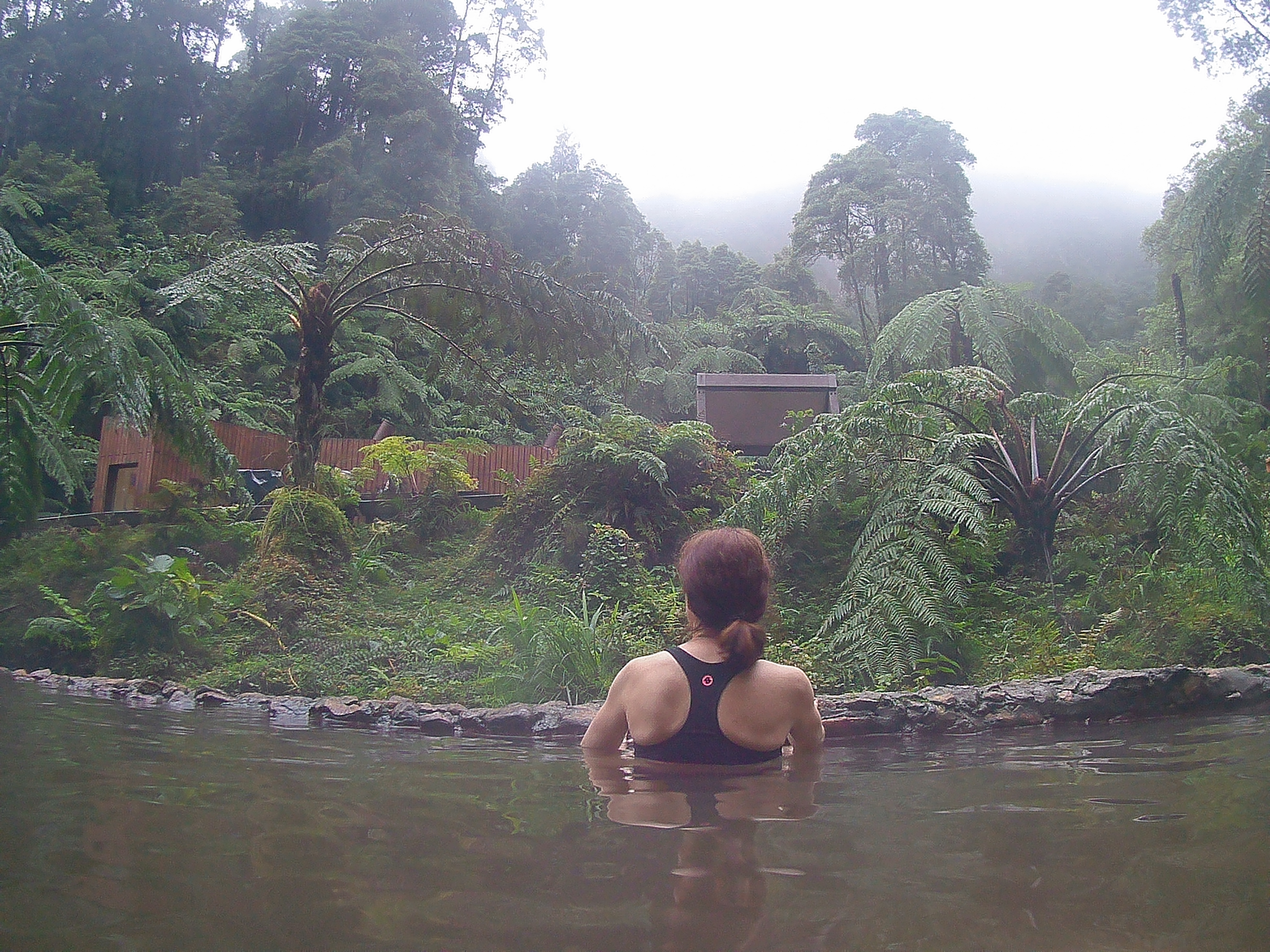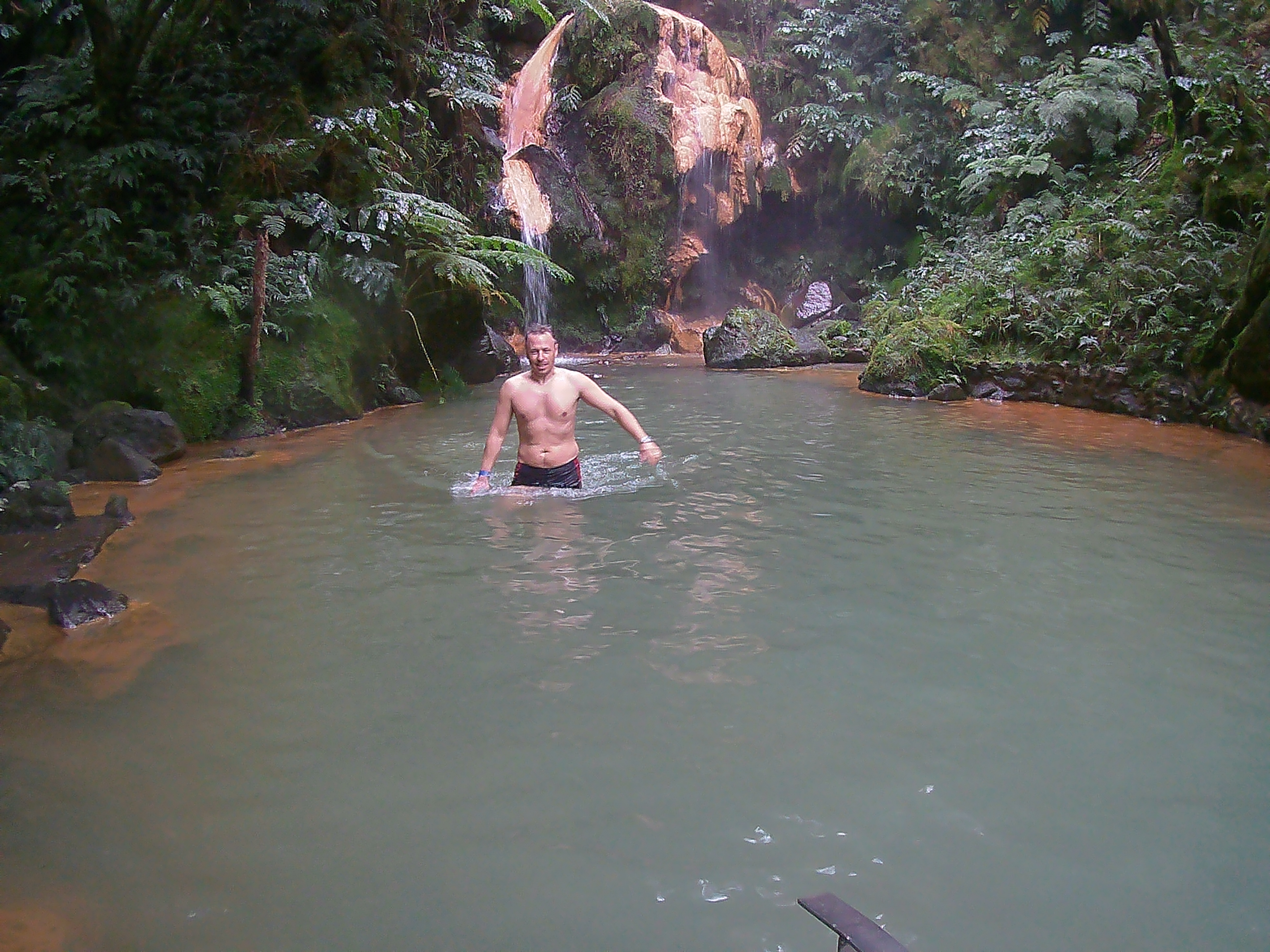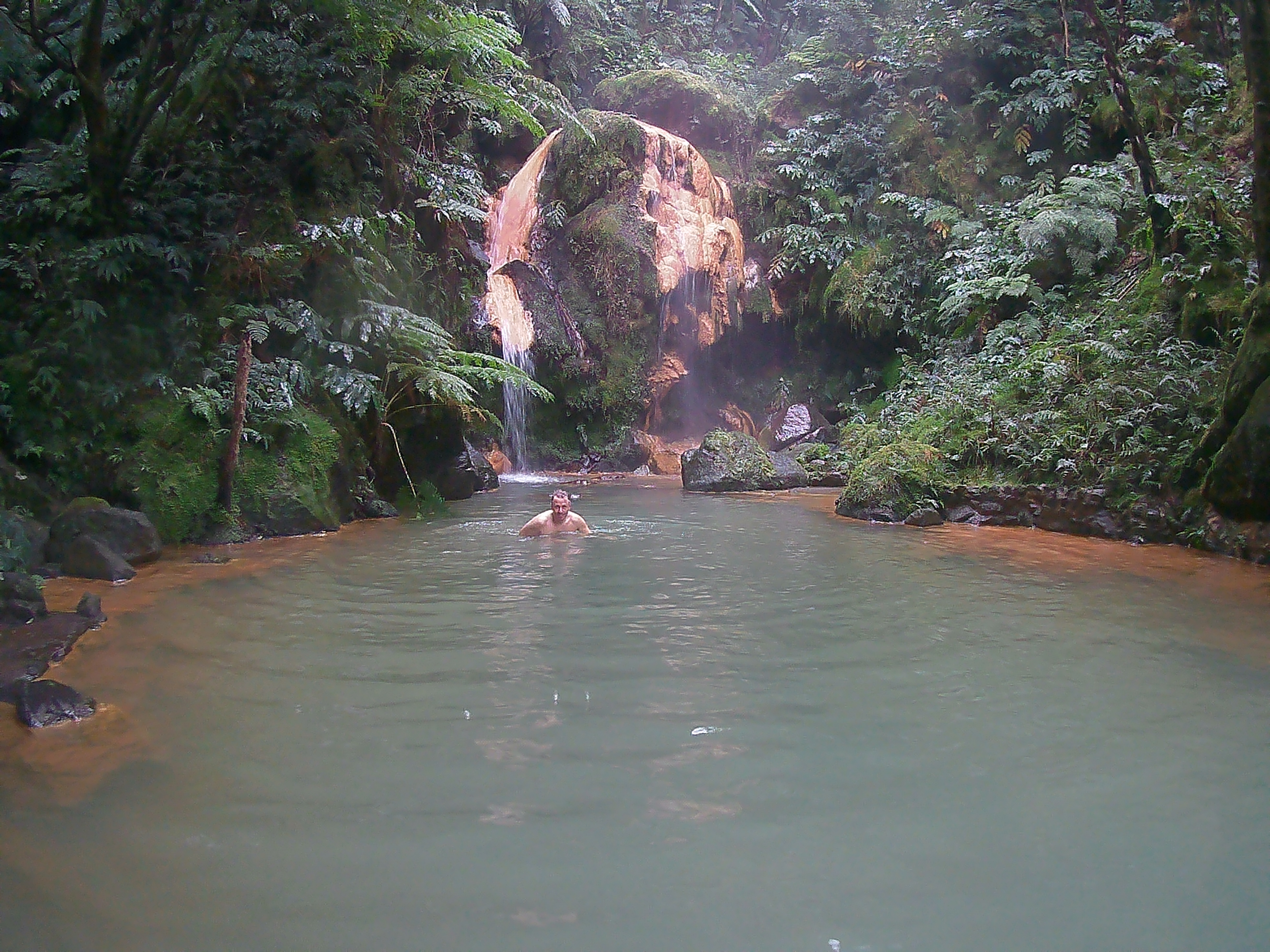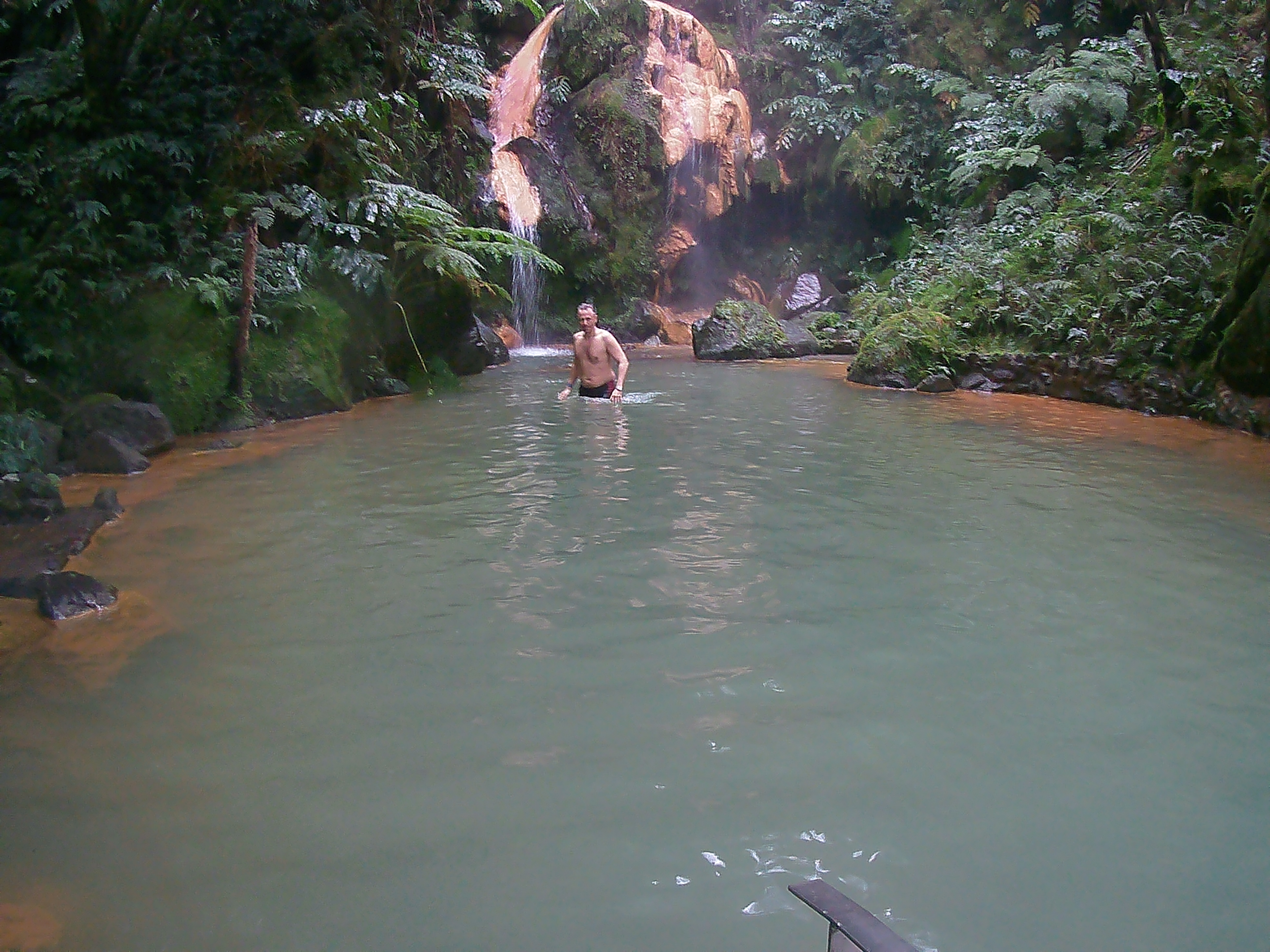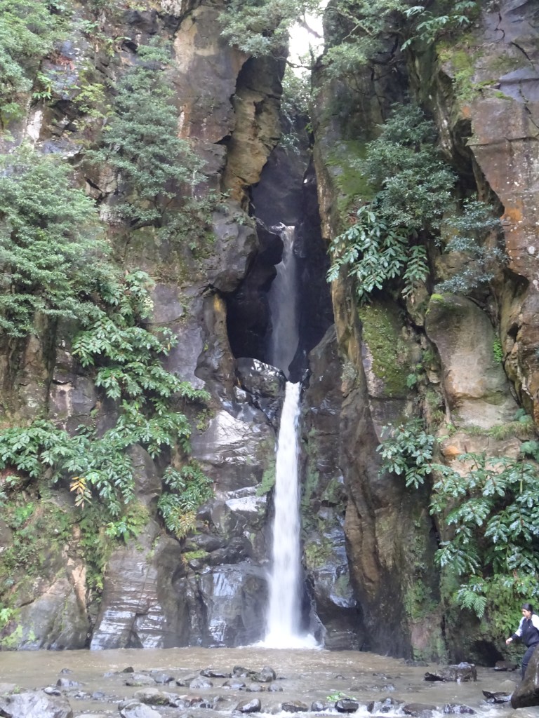 Mir gefällt es so gut, dass wir alles auch wieder zurückgehen, um dann noch rechtzeitig bei der nächsten Sehenswürdigkeit zu sein. Jeweils 2 Stunden darf man die Caldeira Velha besichtigen. Ein Naturschwimmbad mit Wasserfall und heißen Quellen. Das Becken mit dem Wasserfall ist mir zu kalt, ich ziehe die heißen Pools mit Blick in den Regenwald/ Dschungel wie auch immer man es nennen mag. Da sitzt man dort 38 Grad warmen Wasser und lässt sich vom Grün der Bäume, Farne, Moose in Trance lullen, so dass man nicht mehr an die Welt da draußen denkt.