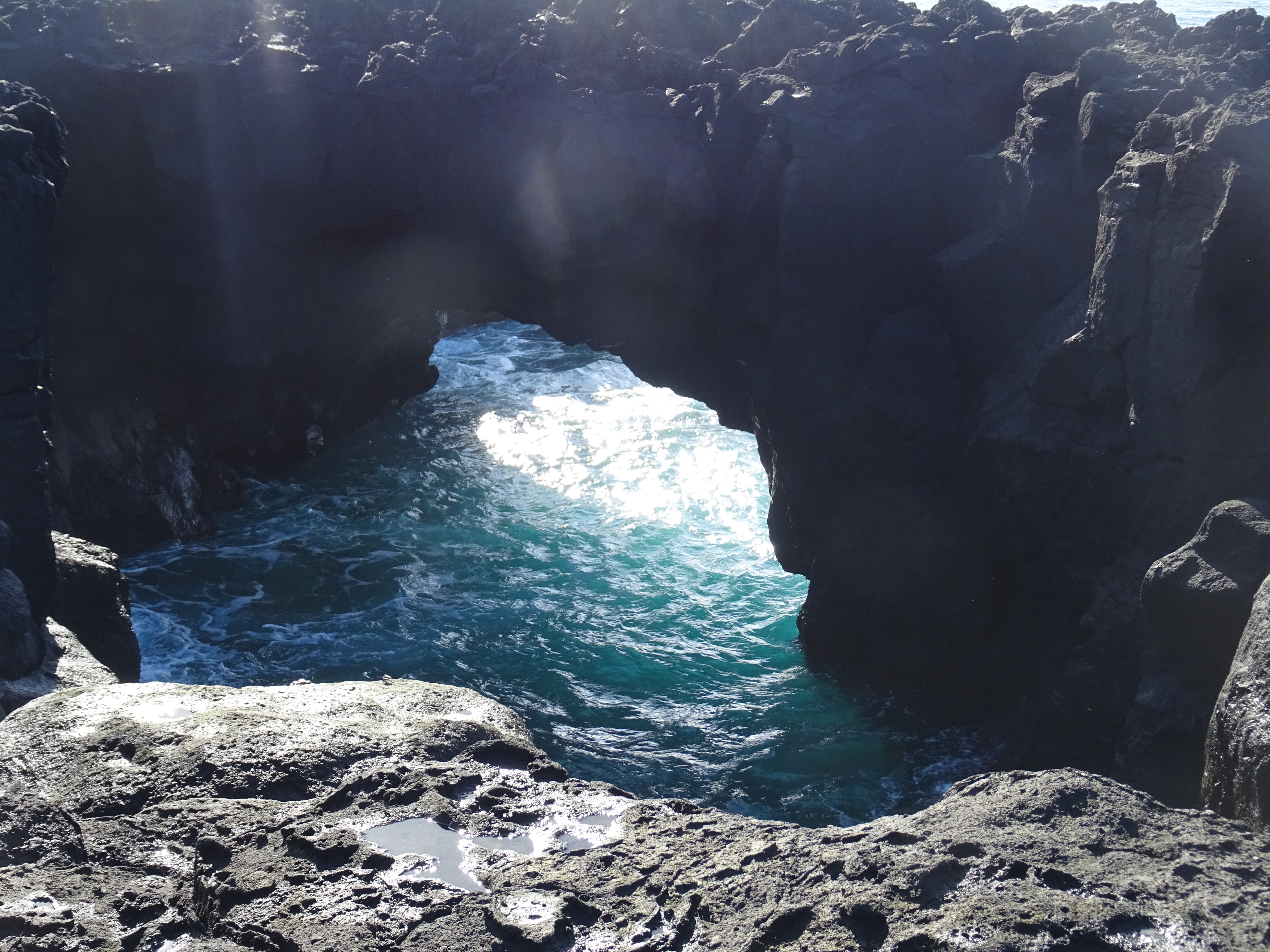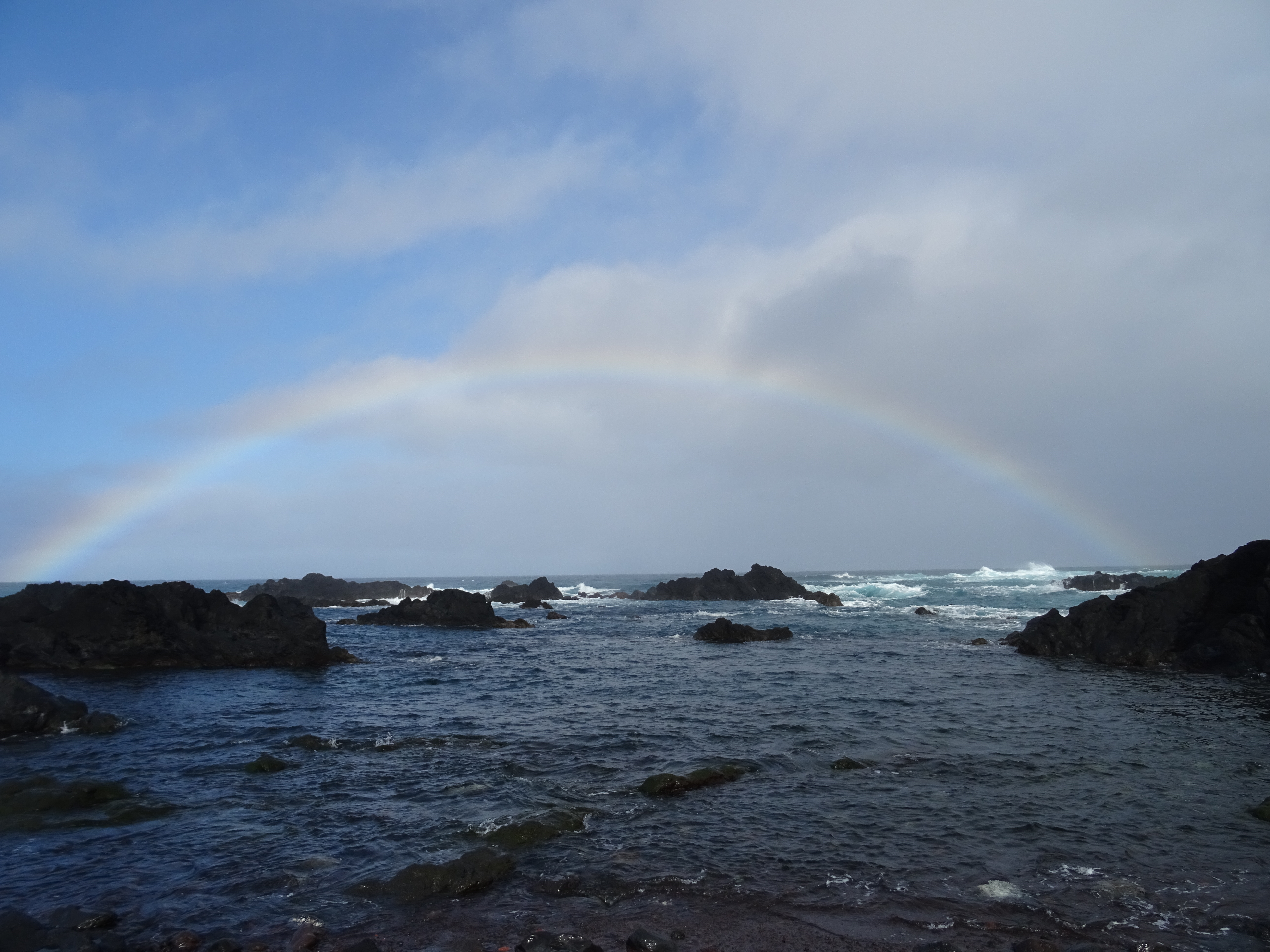 Wir frühstücken in der Tat auf der Terrasse mit Meerblick und in Jacken, denn es ist doch etwas schattig. Im Internet hatte ich noch eine tolle Wanderung gefunden an Wasserkanälen, mit Höhlen, Tunneln und Molchen in einem Becken, dafür musste man mit dem Mietwagen bis nach Remedios fahren. Der Ort liegt auf der anderen Seite der Insel, also einmal querrüber und man ist in 30 Minuten da. Dort angekommen finden wir den Wanderweg nicht und da kommt dank Internetrecherche heraus, dass es den Ort mit demselben Namen noch mal auf der Insel gibt und zwar ganz in der Nähe unserer Unterkunft. Oh, ich versinke im Erdboden und versuche dann doch noch das beste daraus zu machen. Wir fahren also noch den Teil der Küstenstraße ab, der uns noch fehlte, machen Fotos von der Küste mit Bilderbuchregenbogen, schauen uns den zum Verkauf stehenden Leuchtturm an und das Lavafeld direkt an der Küste mit Naturbogen im Wasser.