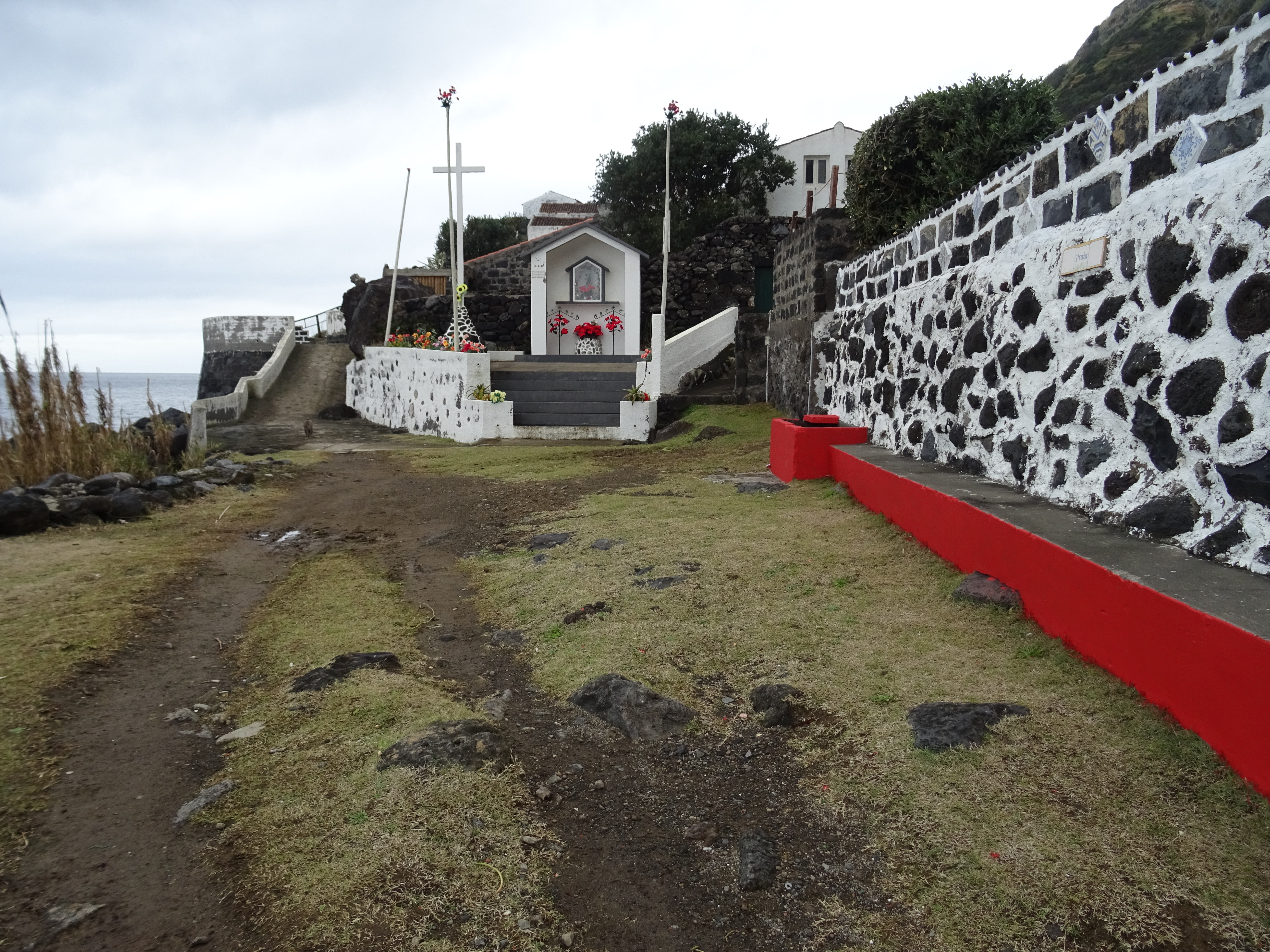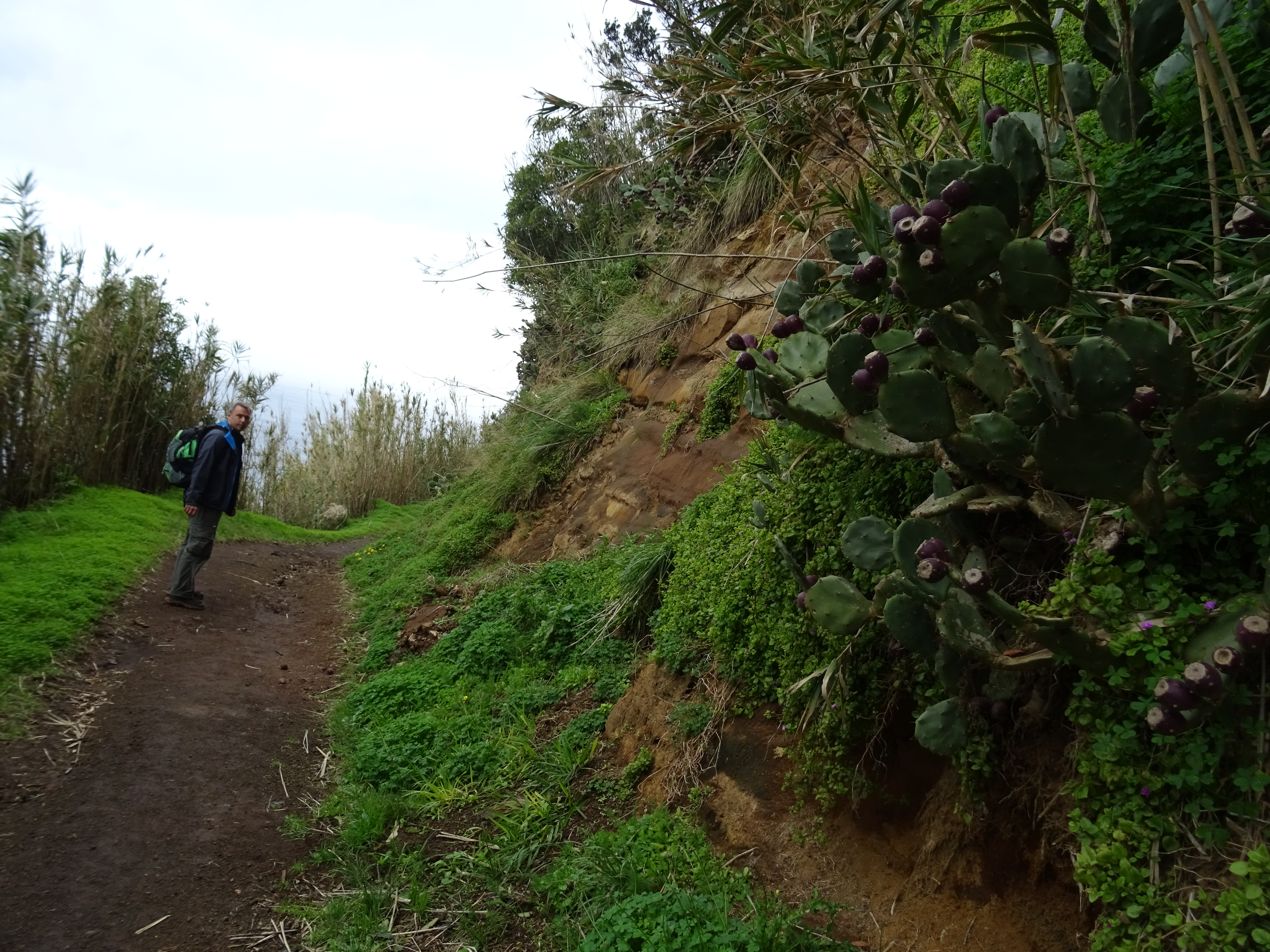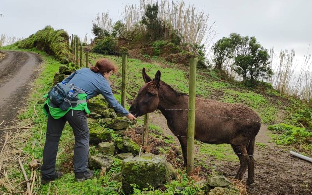 Ich nerve Marcus, dass ich noch keinen Esel gesehen habe, obwohl sie im Reiseführer öfters erwähnt werden. Auf dem holprigen Weg zum Wanderparkplatz stehen sie dann doch auf den Koppeln und schauen neugierig auf die neuen Besucher. Wir spielen ihnen das IA aus dem Internet laut übers Handy vor und was passiert? Na klar, sie antworten ein IA nach dem anderen ist zu hören, ich finde es sehr lustig. Meinen gerade noch als Proviant gekauften Apfel verspreche ich den geduldig wartenden Eseln für nach der Wanderung. Die Wanderung halten wir kürzer als man gehen könnte, denn sie ist schon steil und rutschig genug, in den geteerten Weg sind überall Steine eingearbeitet, damit Mensch und Esel Halt findet, sonst wäre es bei Regen eine glitschige Rutsche bis zum Meer.