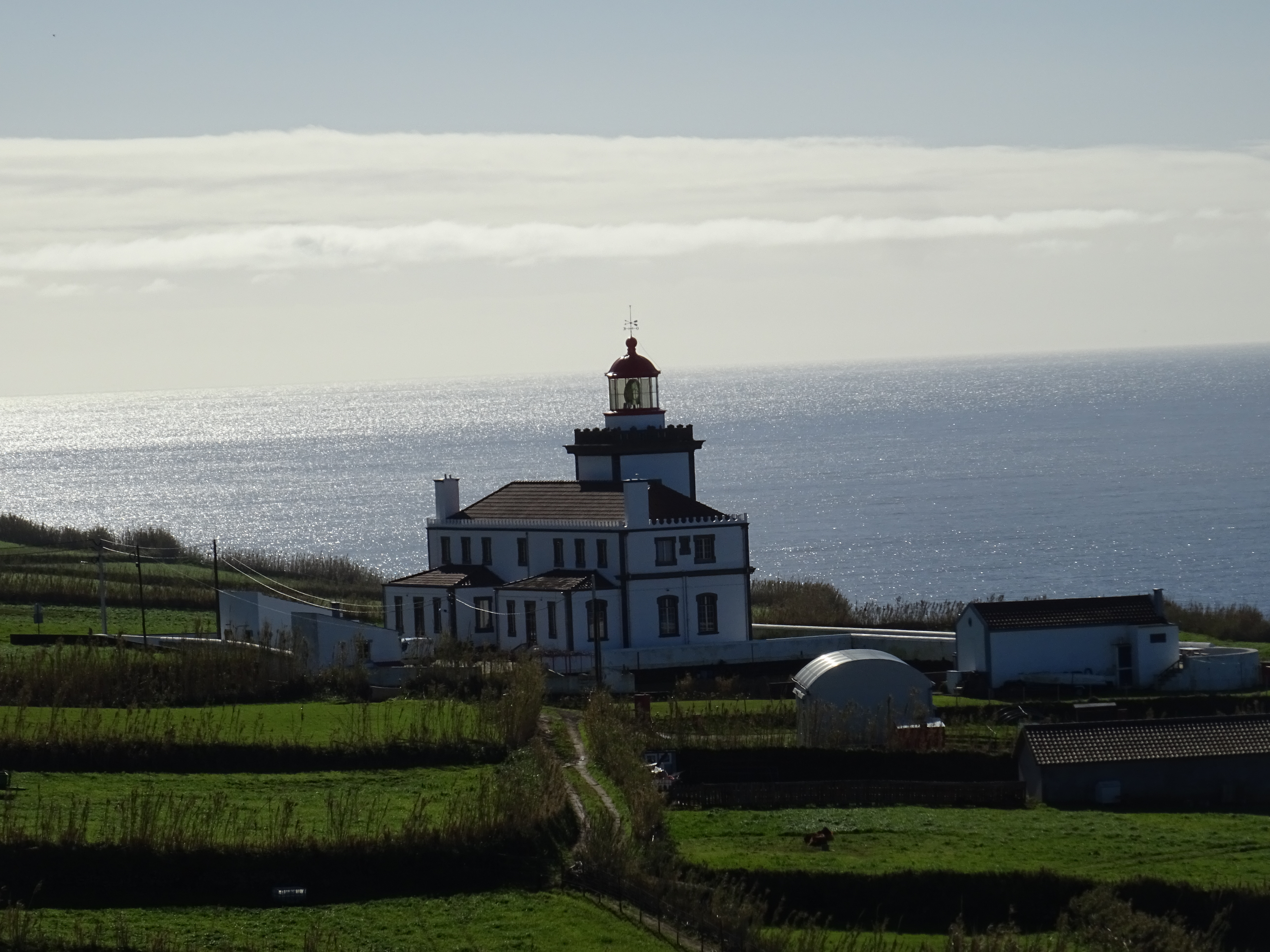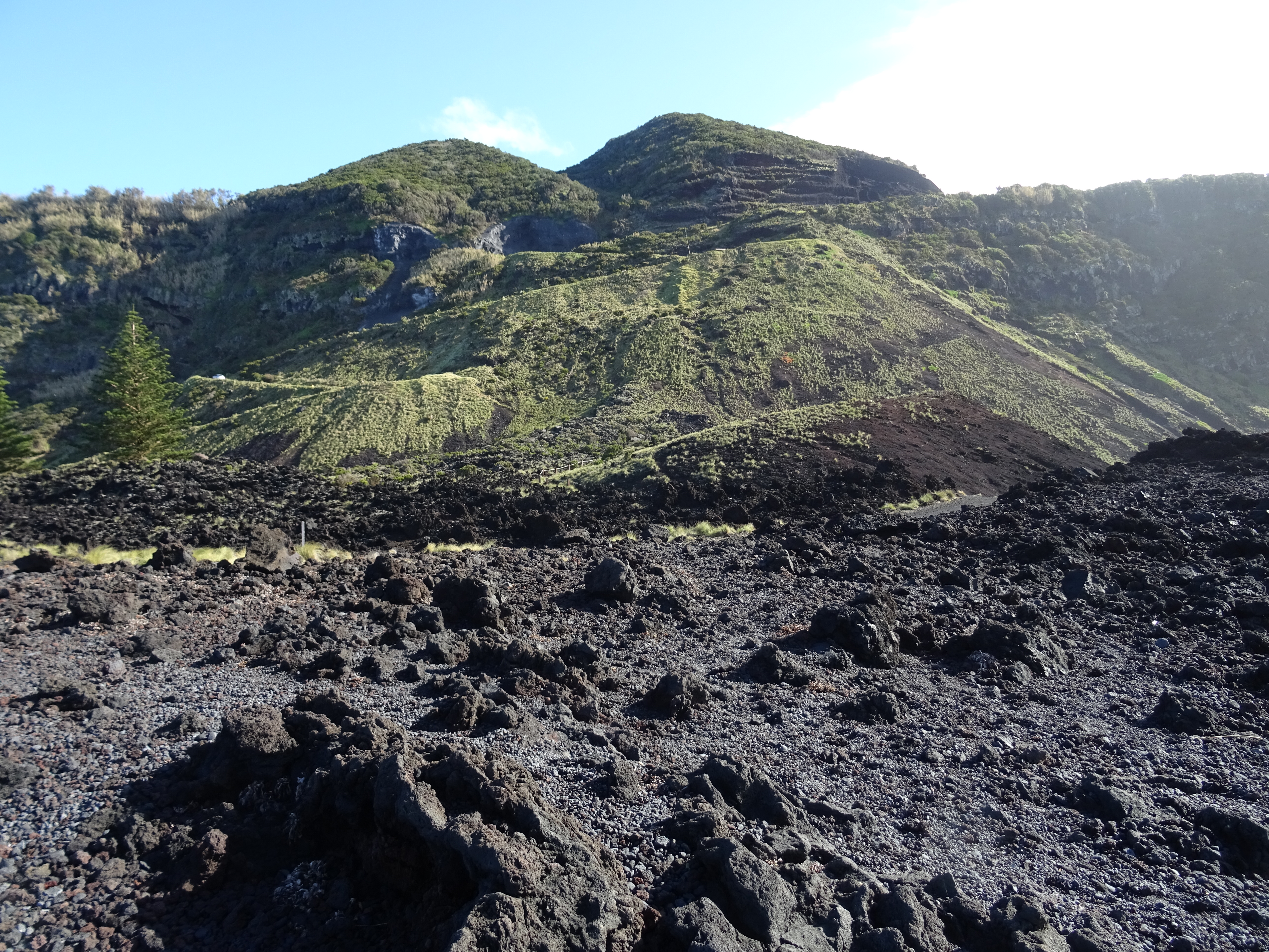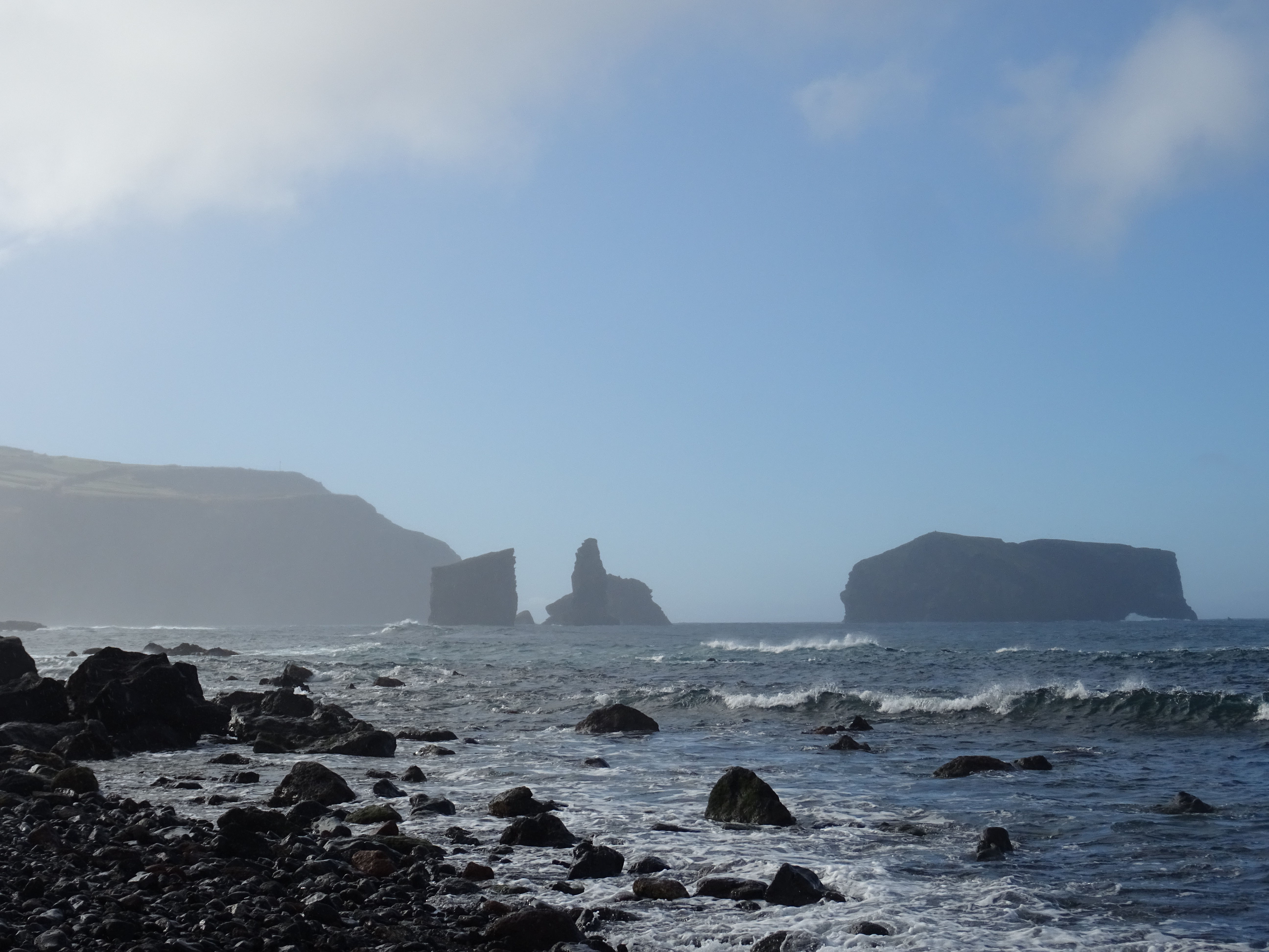 Ich nerve Marcus, dass ich noch keinen Esel gesehen habe, obwohl sie im Reiseführer öfters erwähnt werden. Auf dem holprigen Weg zum Wanderparkplatz stehen sie dann doch auf den Koppeln und schauen neugierig auf die neuen Besucher. Wir spielen ihnen das IA aus dem Internet laut übers Handy vor und was passiert? Na klar, sie antworten ein IA nach dem anderen ist zu hören, ich finde es sehr lustig. Meinen gerade noch als Proviant gekauften Apfel verspreche ich den geduldig wartenden Eseln für nach der Wanderung. Die Wanderung halten wir kürzer als man gehen könnte, denn sie ist schon steil und rutschig genug, in den geteerten Weg sind überall Steine eingearbeitet, damit Mensch und Esel Halt findet, sonst wäre es bei Regen eine glitschige Rutsche bis zum Meer.