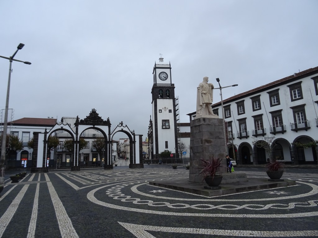 Da wir immer noch etwas Zeit bis zum Einbruch der Dunkelheit haben, schauen wir uns noch die Hauptstadt an. Ponta Delgada ist wenig einladend und ich weiß nicht so recht, was ich hier fotografieren soll, außer das Tor am Hauptplatz.
