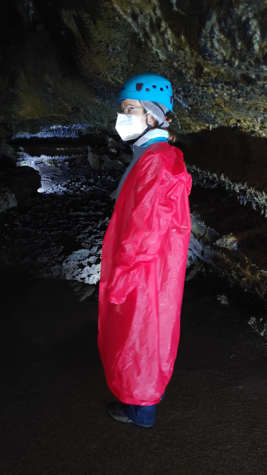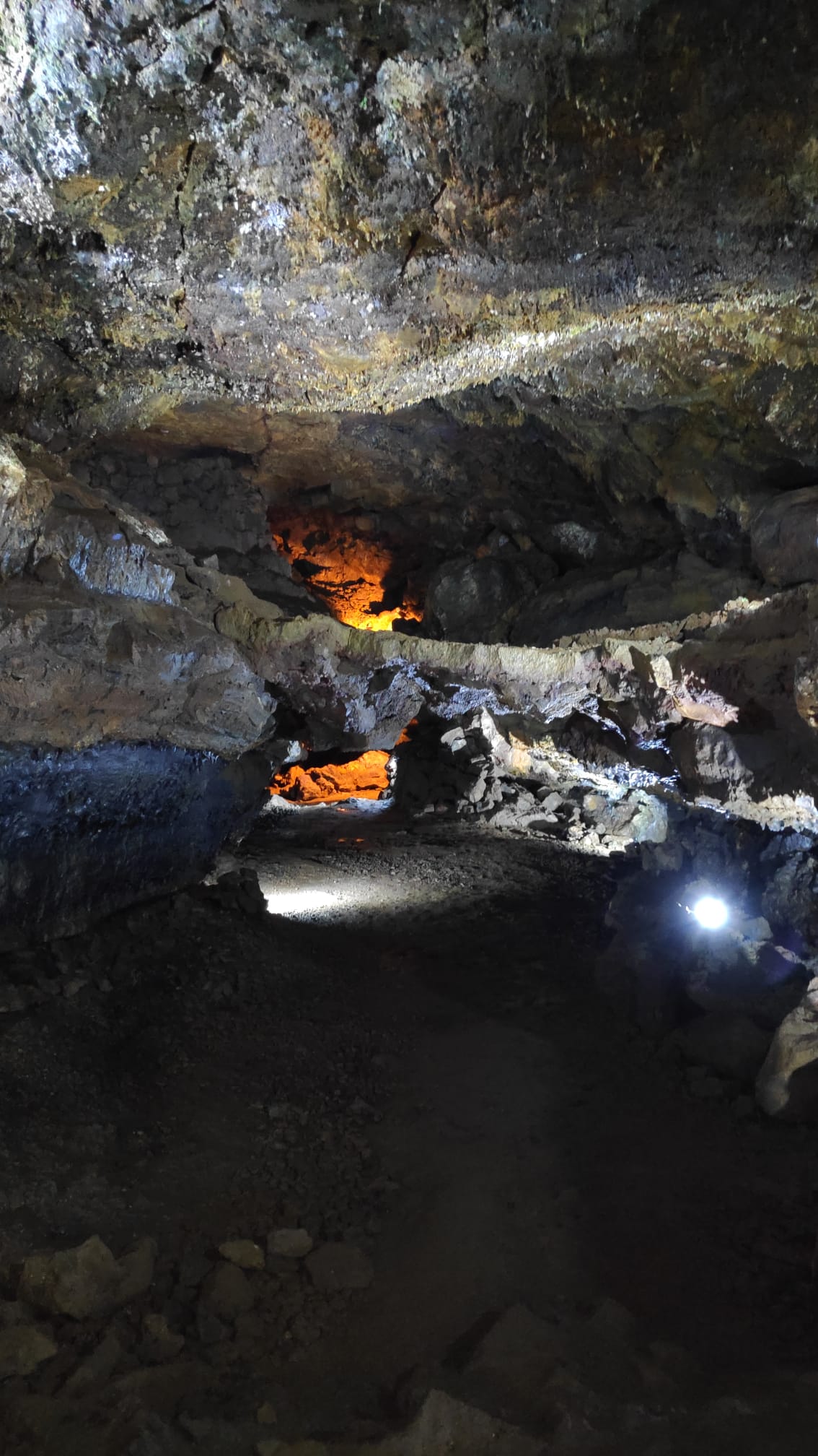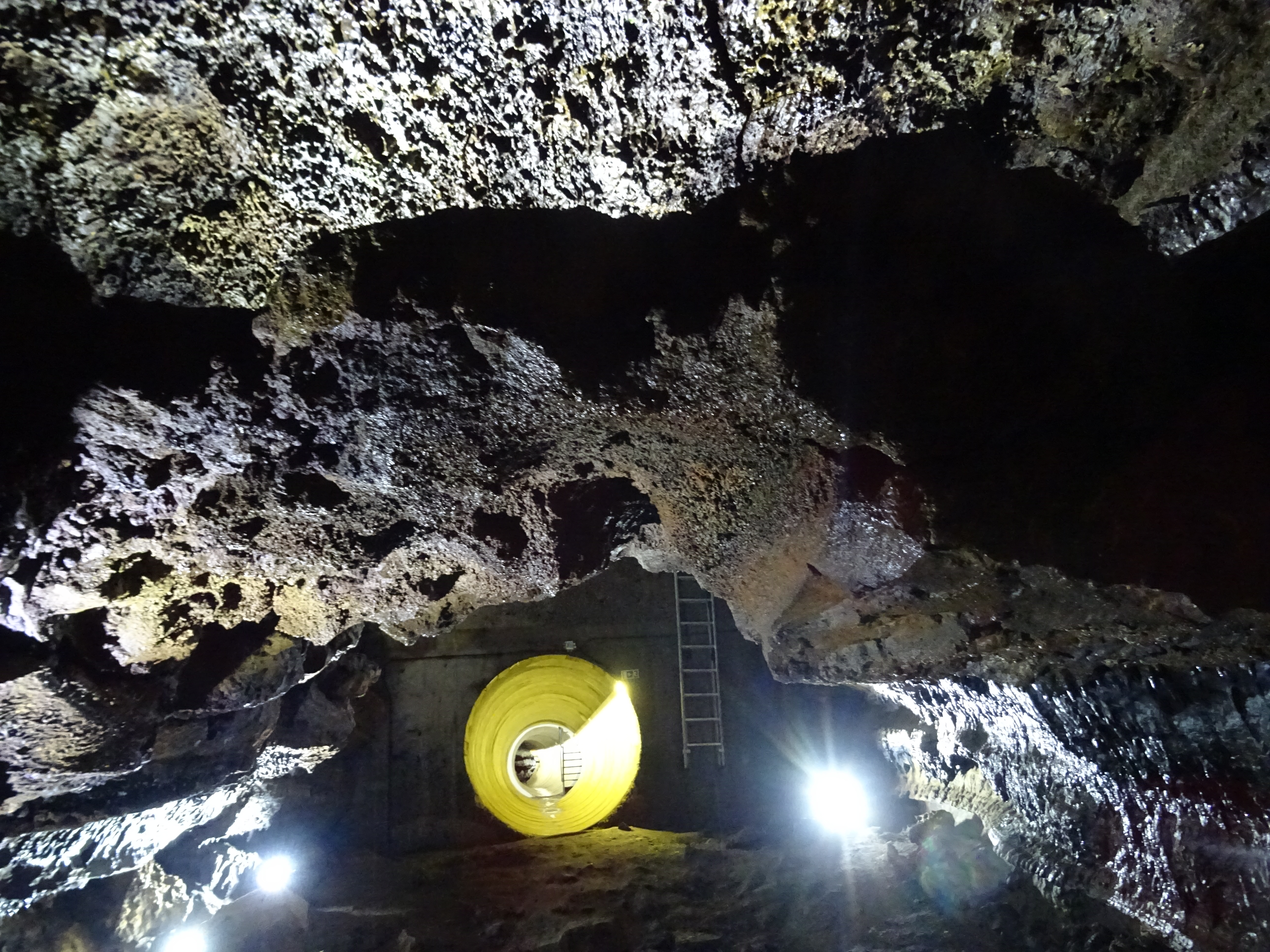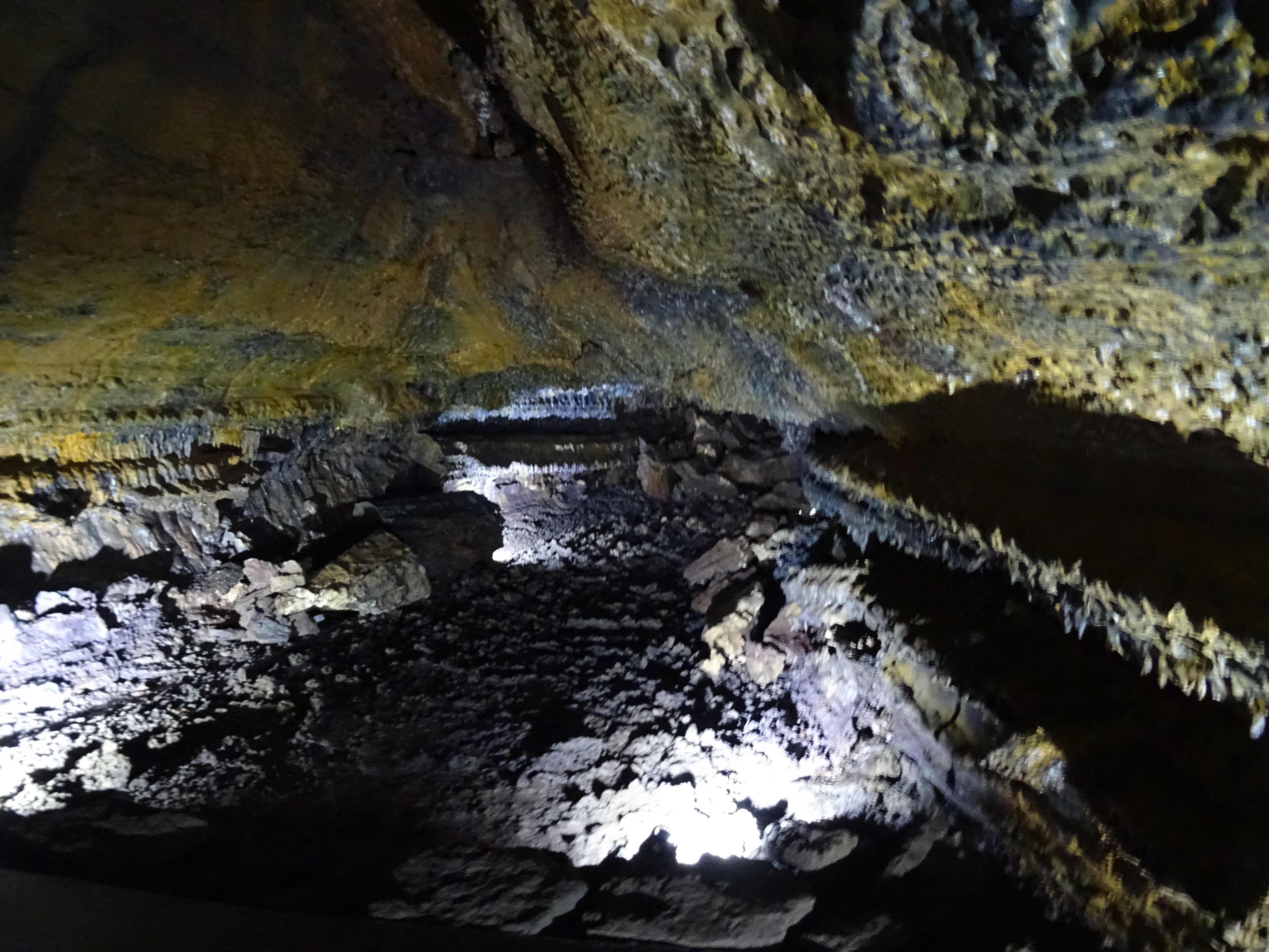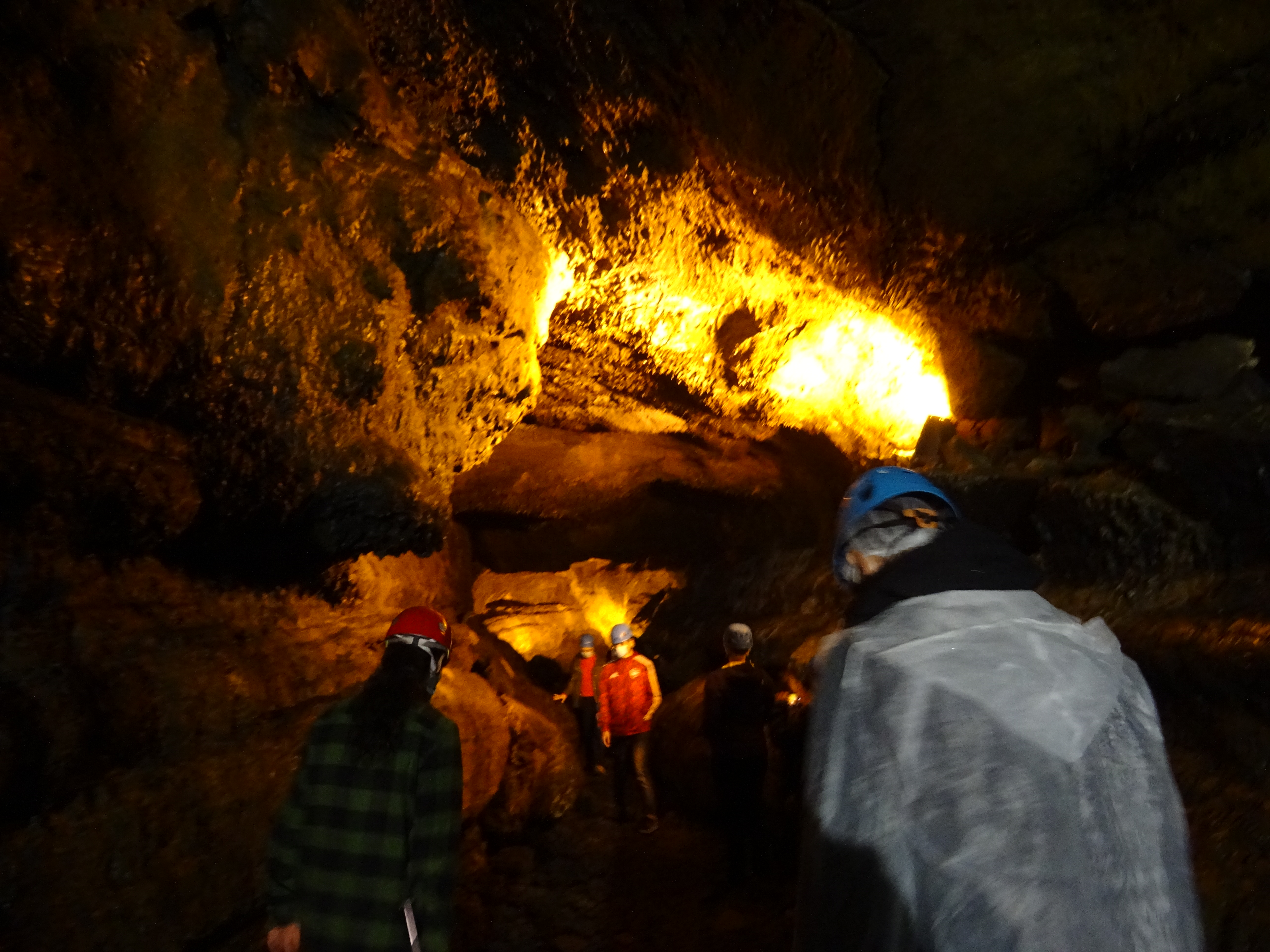 Und dann sehen wir endlich unser Highlight des Tages, die Höhle. Das spannendste war wohl das Haarnetz und der Helm zu Anfang und dann talpen wir durch Tunnel in die scharfkantige Lavahöhle, erst der eine Raum, dann durch den Tunnel in den anderen Raum. Obwohl der Guide sich alle Mühe gibt, ist auch hier schnell die Luft raus und wir müssen nach 45 Minuten wieder durch den Regen zum Auto.