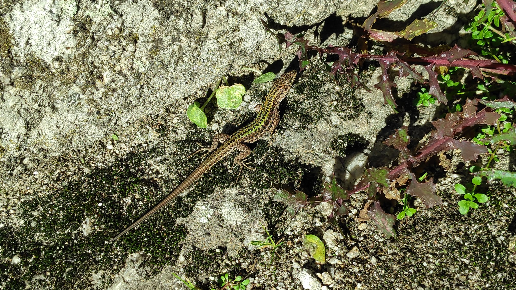 Interessanter finden wohl alle Besucher eher die Burg, bei der nur noch die Außenmauern mit Wehrgang bestehen, aber es ist trotzdem schön an den Zinnen entlang zu wandeln und immer neue Perspektiven der Burg zu sehen oder eine Eidechse.