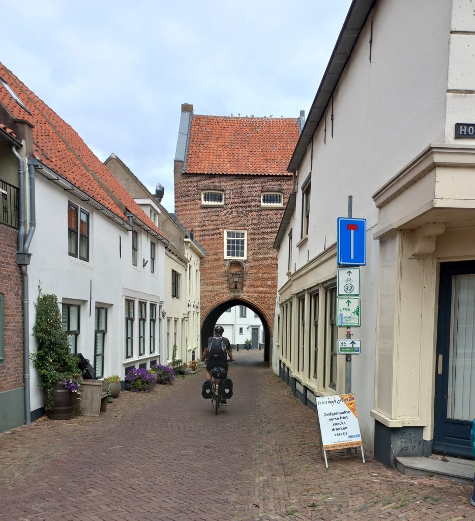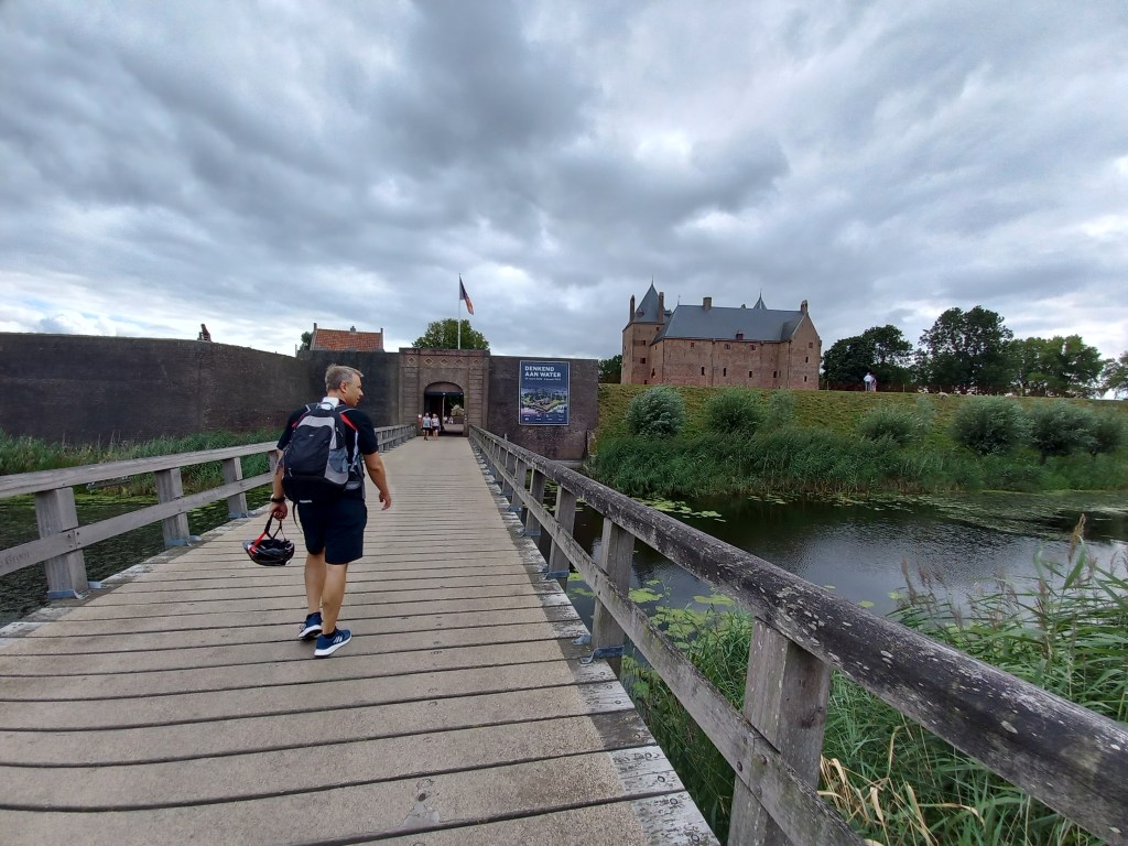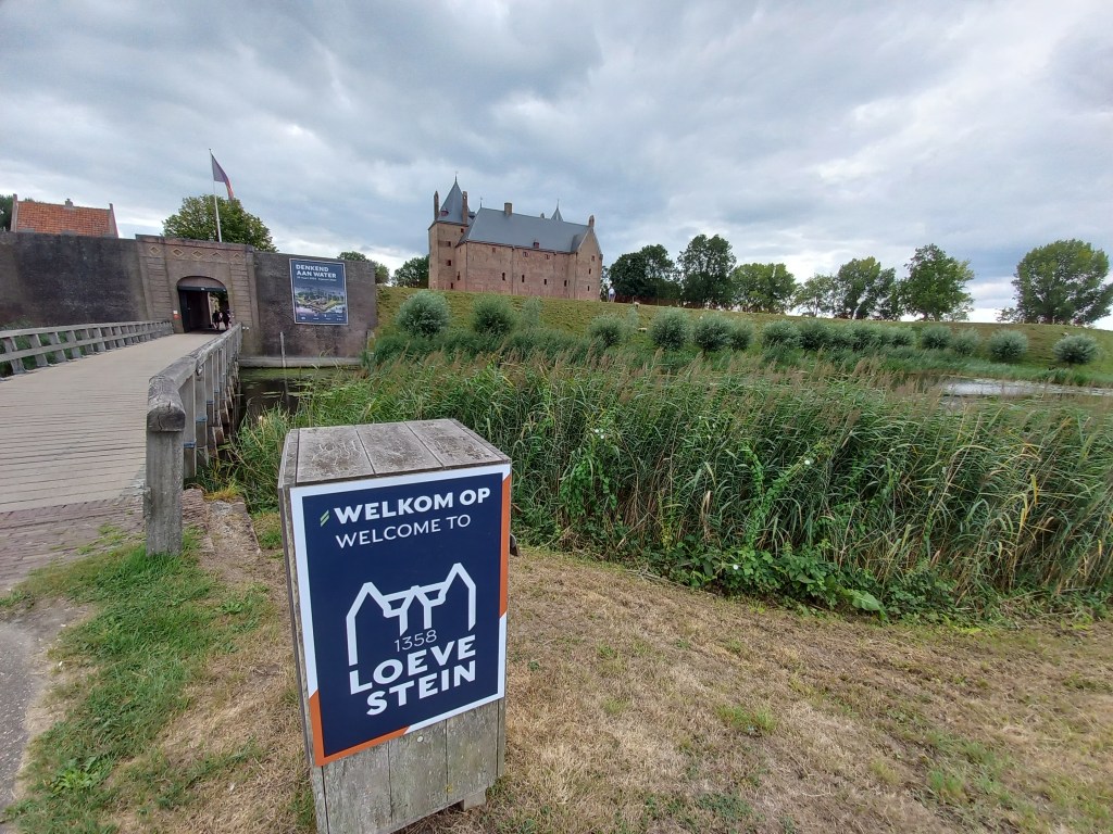 Nach 40 km, einem Storch, erreichen wir das Highlight der heutigen Tour, Loevestein. Mit einer Wehrmauer, Wassergraben und allein auf weiter Flur wird die Burg zum Ausflugziel von Touristen und Holländern gleichermaßen ins Visier genommen.