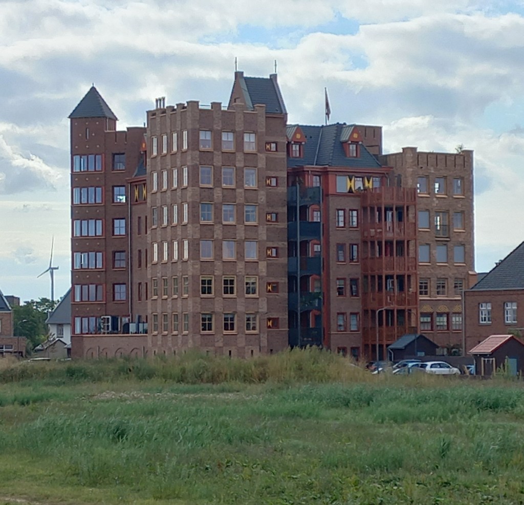 Die Maasroute führt uns an den neuen Baustilen vorbei, modern, aber trotzdem hat das Gebäude noch Burgcharakter und so werden mehrere Hochhäuser in die Landschaft gesetzt.