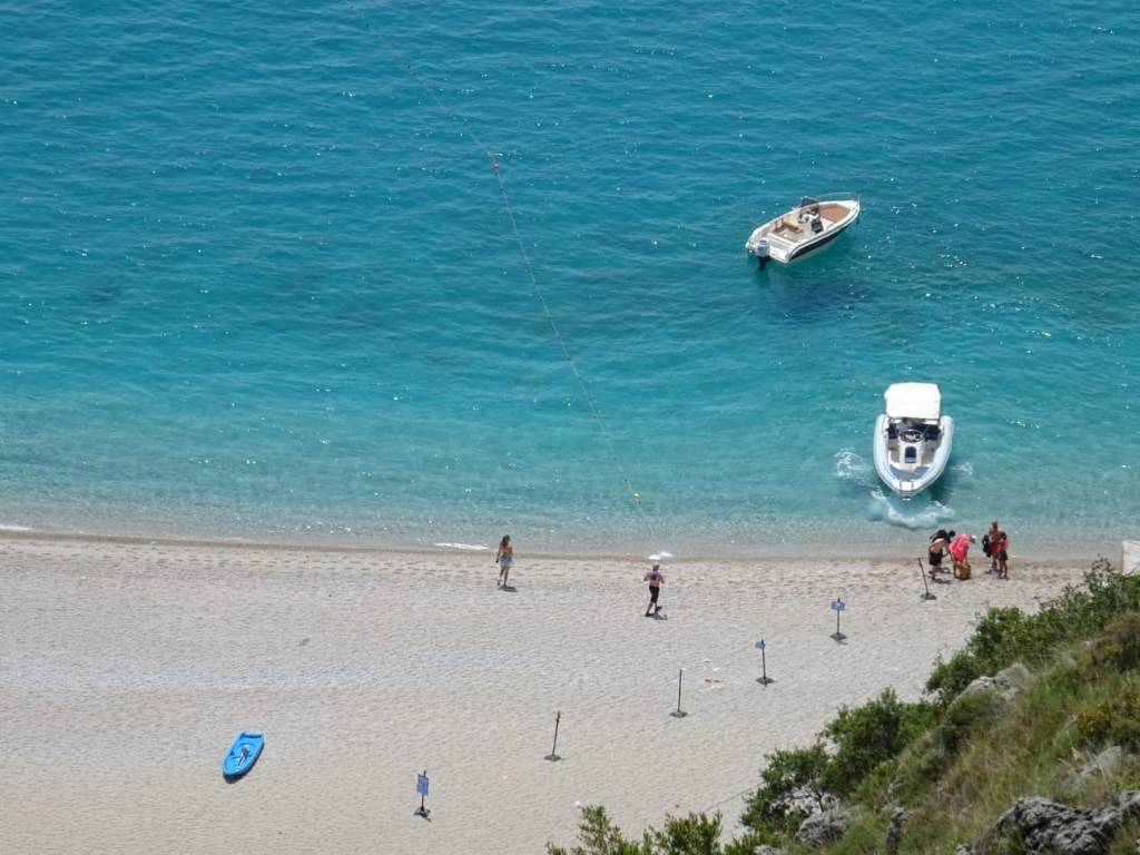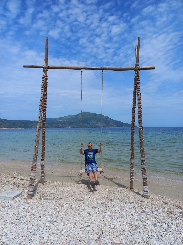Die Küstenstrasse führt uns erstmal an schönen Stränden entlang, aber den Strand mit dem tollen Typen auf der Schaukel gibt es nur in Orikum.