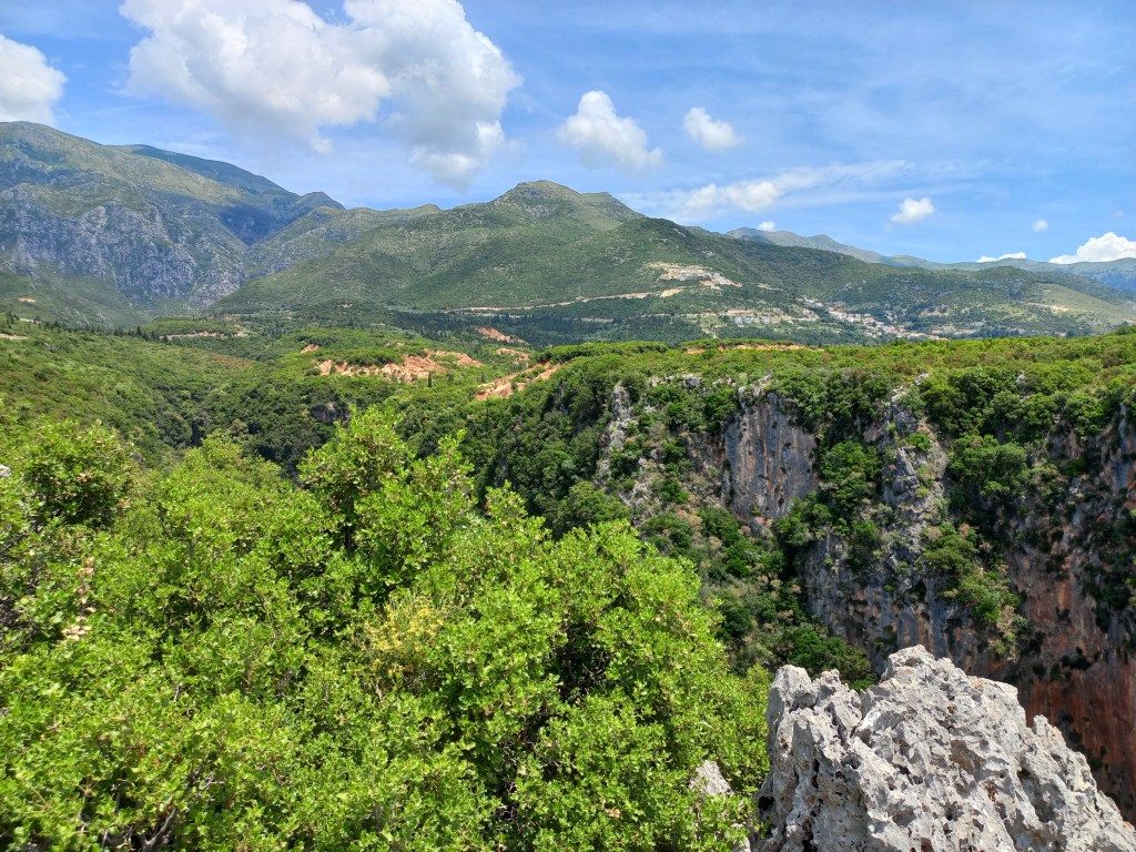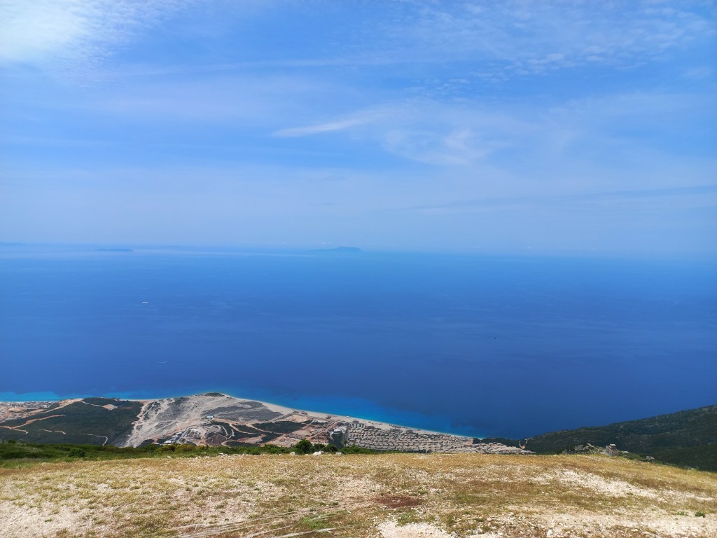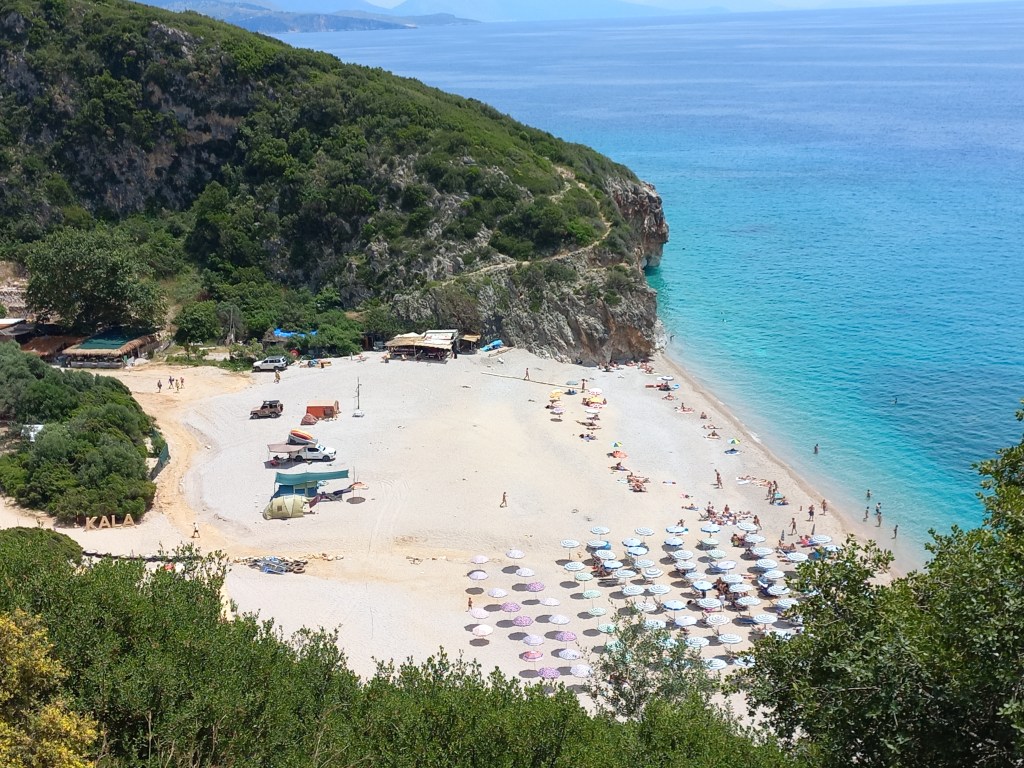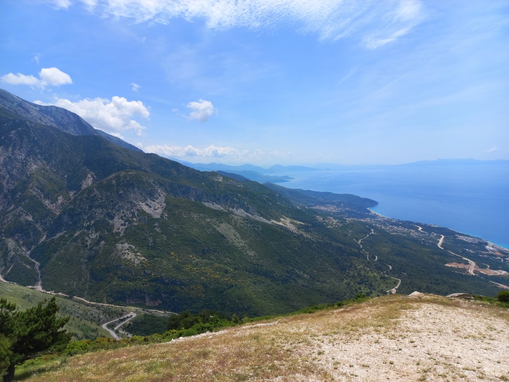 Um zu den bekannten Stränden wie Himare und Sarande zu kommen, muss man durchs Gebirge fahren, eine Passstraße mit zum Teil 10% Steigung. Unsere Karre ächzt im 1. Gang um die Kurven und teilweise drehen die Reifen durch, beim ersten schönen Aussichtspunkt hoffen wir jetzt wiederum auf die Bremsentauglichkeit unseres Wagens.