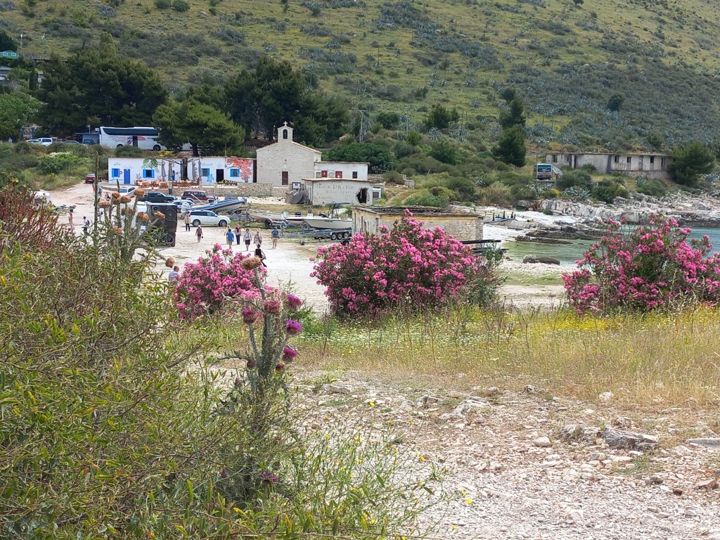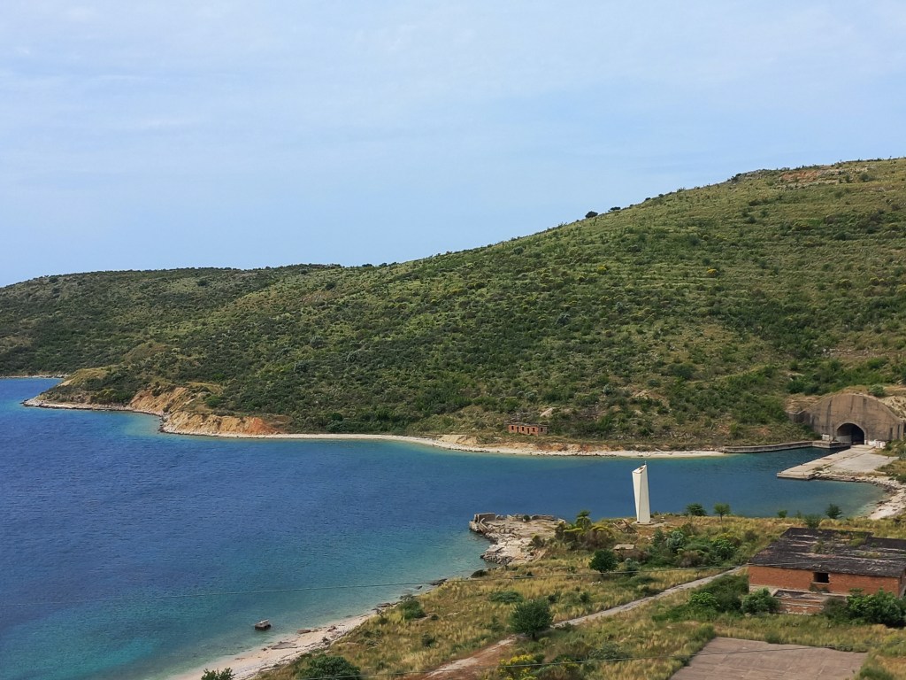 Rund 70 km geht es an der Küste weiter bis Ksamil, dem Trendort schlechthin. Unser erster Fotostopp ist der Bunker für Uboote, allerdings muss das Foto von weit weit weg reichen, es ist 28 Grad und schwül.